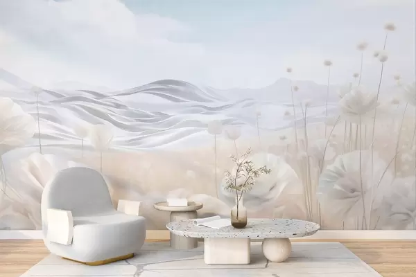 Valokuvatapetti Teksturoitu kenttä kermaisia unikoita ja kumpuilevia kukkuloita vaaleansinisen taivaan alla, jossa on pehmeitä pilviä, pastellivärejä Nr w09553