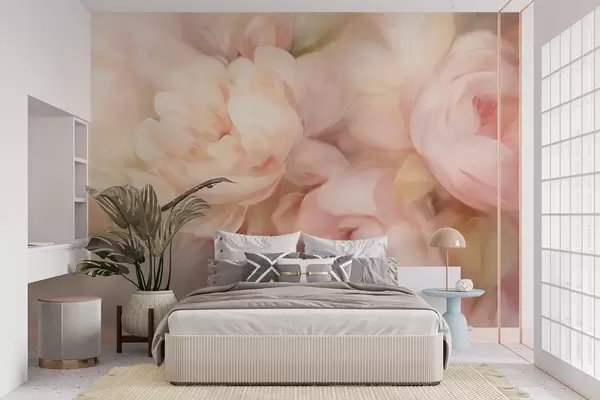 Valokuvatapetti Hämärtyneet vaaleanpunaiset ja kermanväriset pionit, jotka on jäljitelty pehmeillä, maalauksellisilla siveltimenvedoilla, luovat tekstuurisen kukka-asetelman. Nr w09556