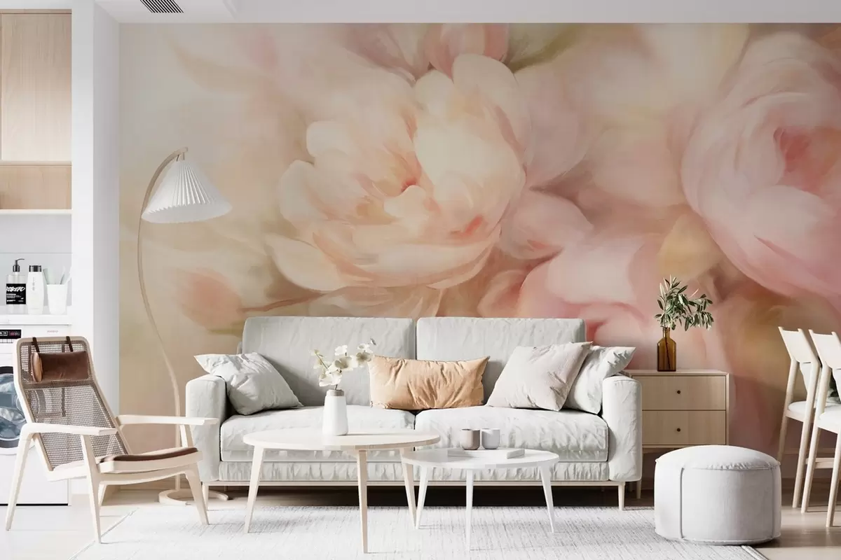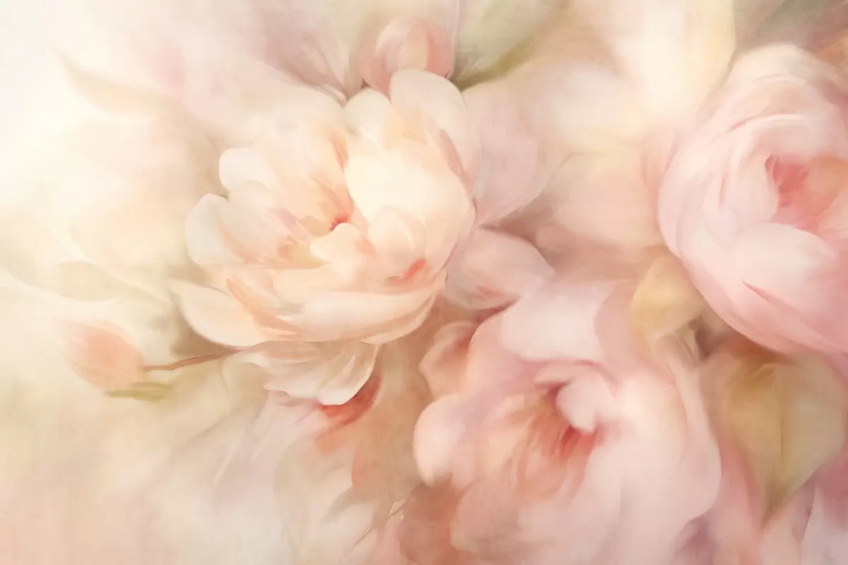 Valokuvatapetti Hämärtyneet vaaleanpunaiset ja kermanväriset pionit, jotka on jäljitelty pehmeillä, maalauksellisilla siveltimenvedoilla, luovat tekstuurisen kukka-asetelman. Nr w09556