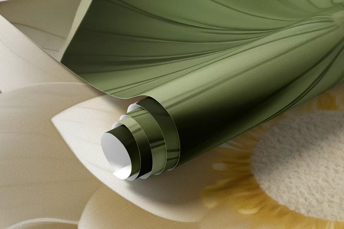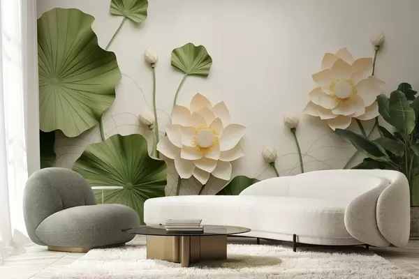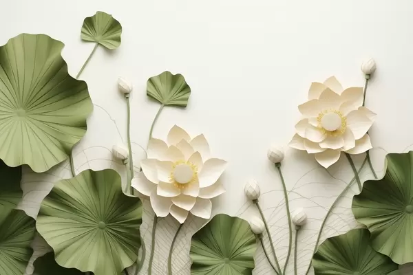 Valokuvatapetti 3D-lootus kukat vihreillä teksturoiduilla lehdillä, minimalistinen tyyli Nr w09560
