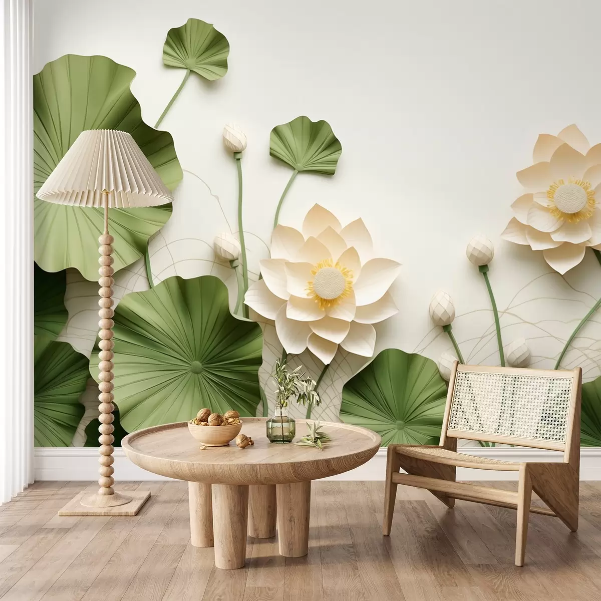 Valokuvatapetti 3D-lootus kukat vihreillä teksturoiduilla lehdillä, minimalistinen tyyli Nr w09560