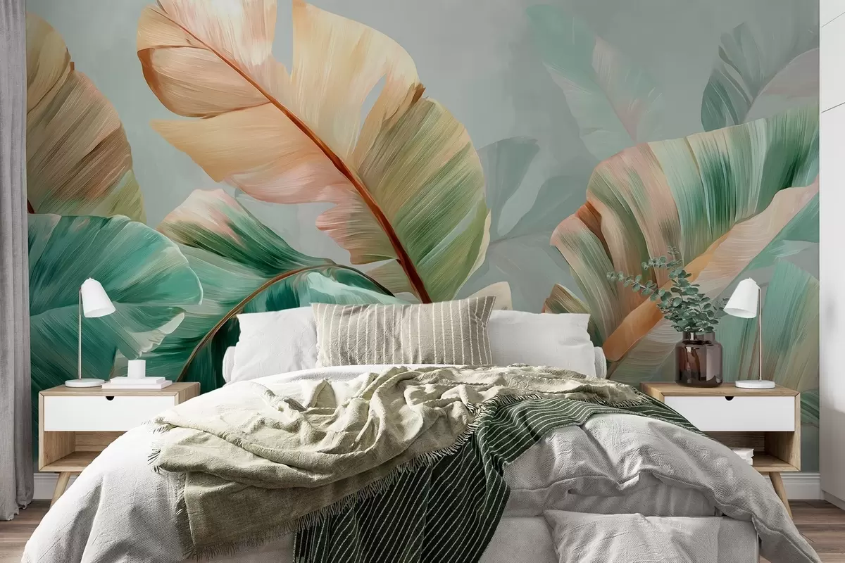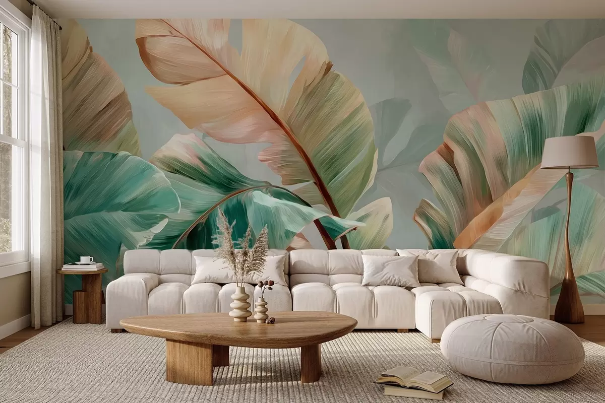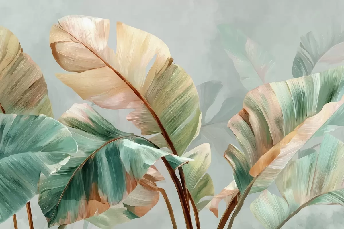 Valokuvatapetti Hienostuneet trooppiset banaaninlehdet pastellin kelta-vihreissä sävyissä Nr w09581