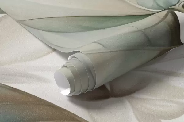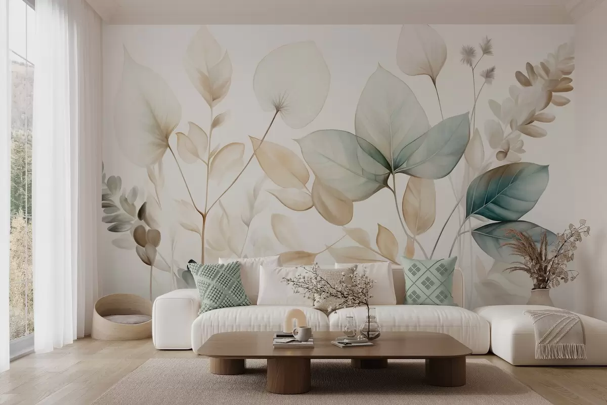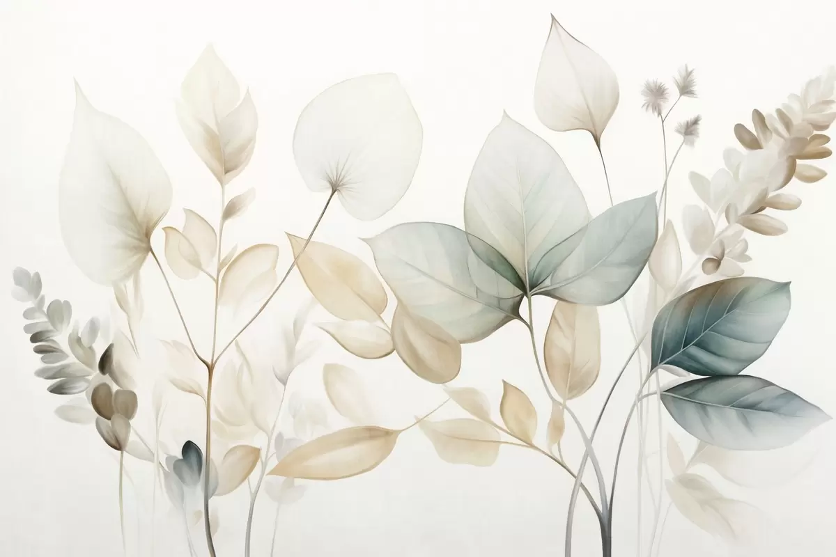 Valokuvatapetti Teksturoidut läpikuultavat lehdet hillityissä beige- ja turkoosinsävyissä, herkät varret pehmeää, vaaleaa taustaa vasten. Nr w09583