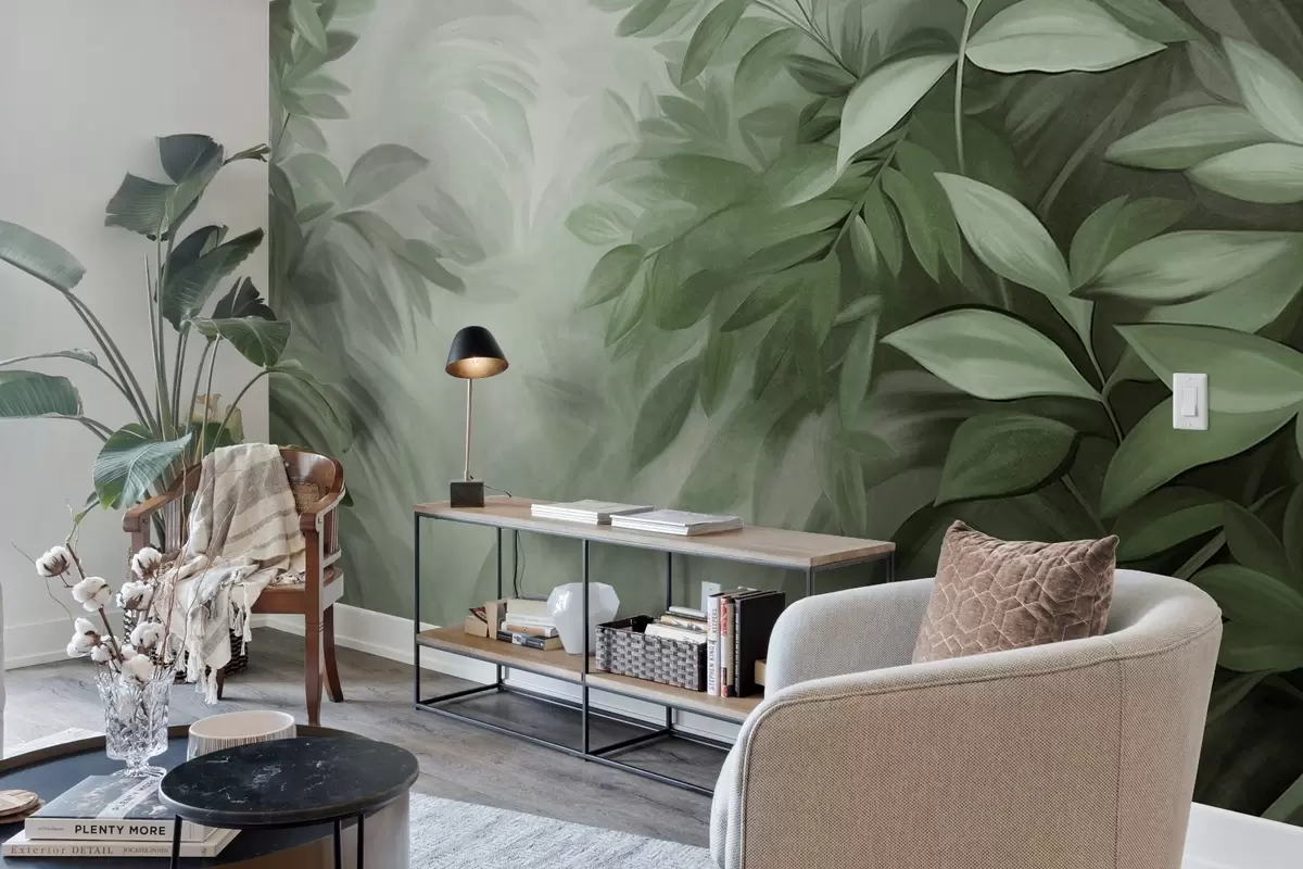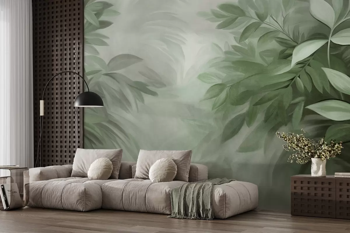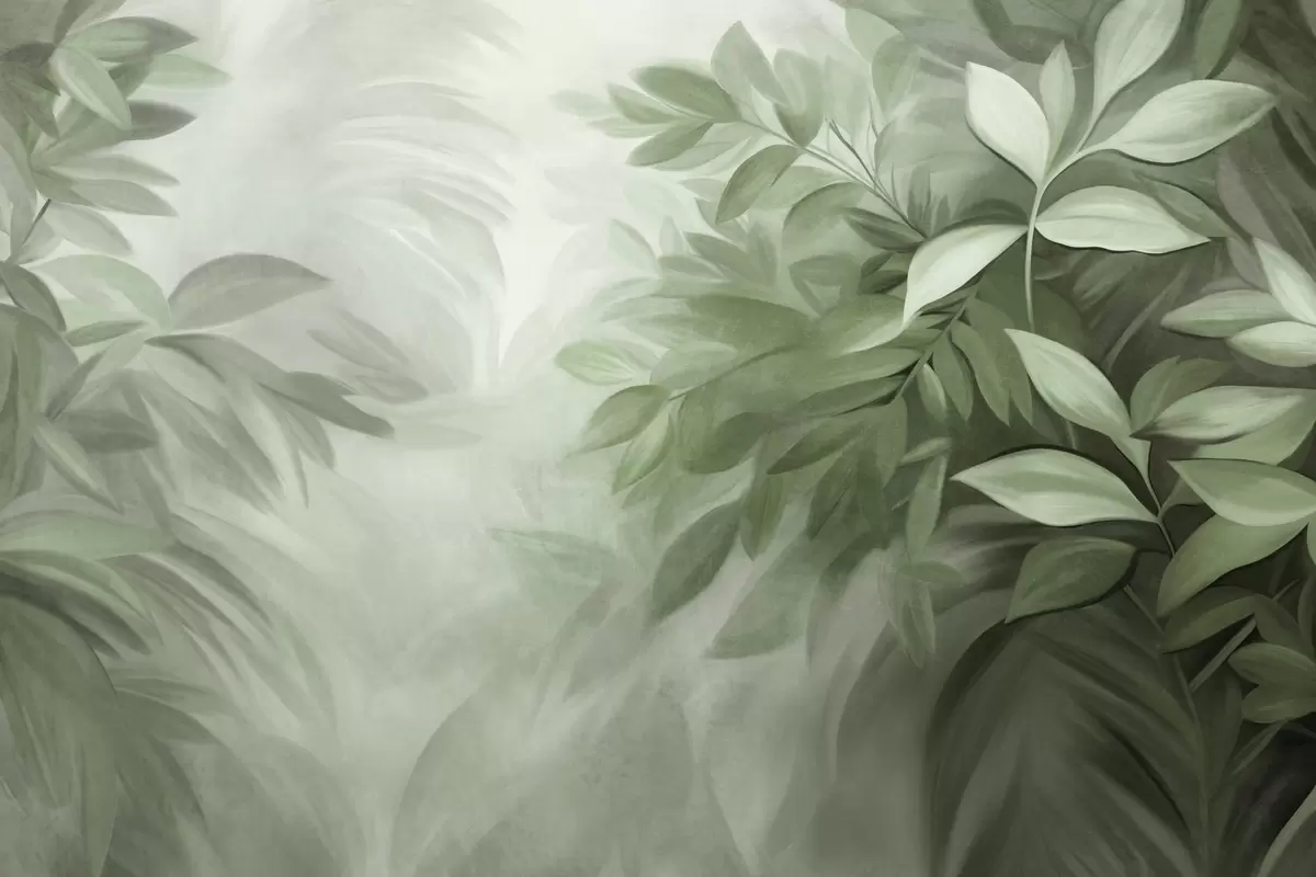 Valokuvatapetti Vihreät ja harmaat lehdet, pehmeä, hämärtynyt tekstuuri, maalauksellinen tyyli, jossa siveltimen vedot näkyvät selvästi. Nr w09584v1