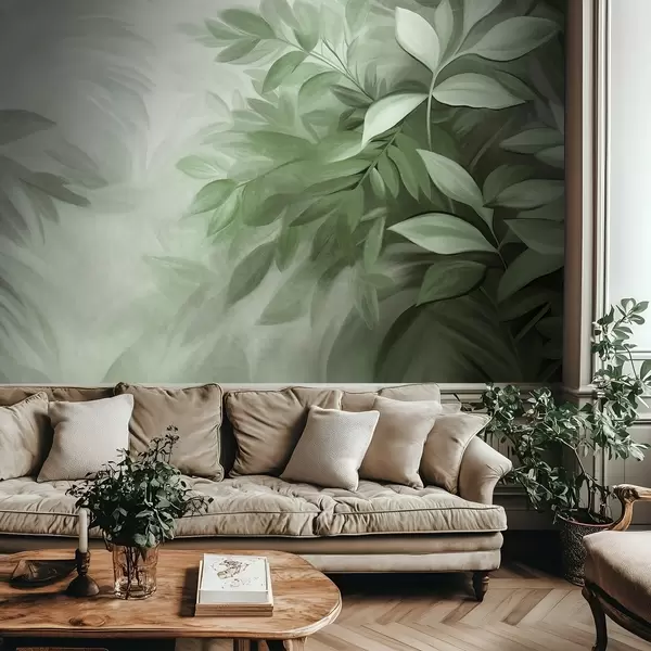 Valokuvatapetti Vihreät ja harmaat lehdet, pehmeä, hämärtynyt tekstuuri, maalauksellinen tyyli, jossa siveltimen vedot näkyvät selvästi Nr w09584v1