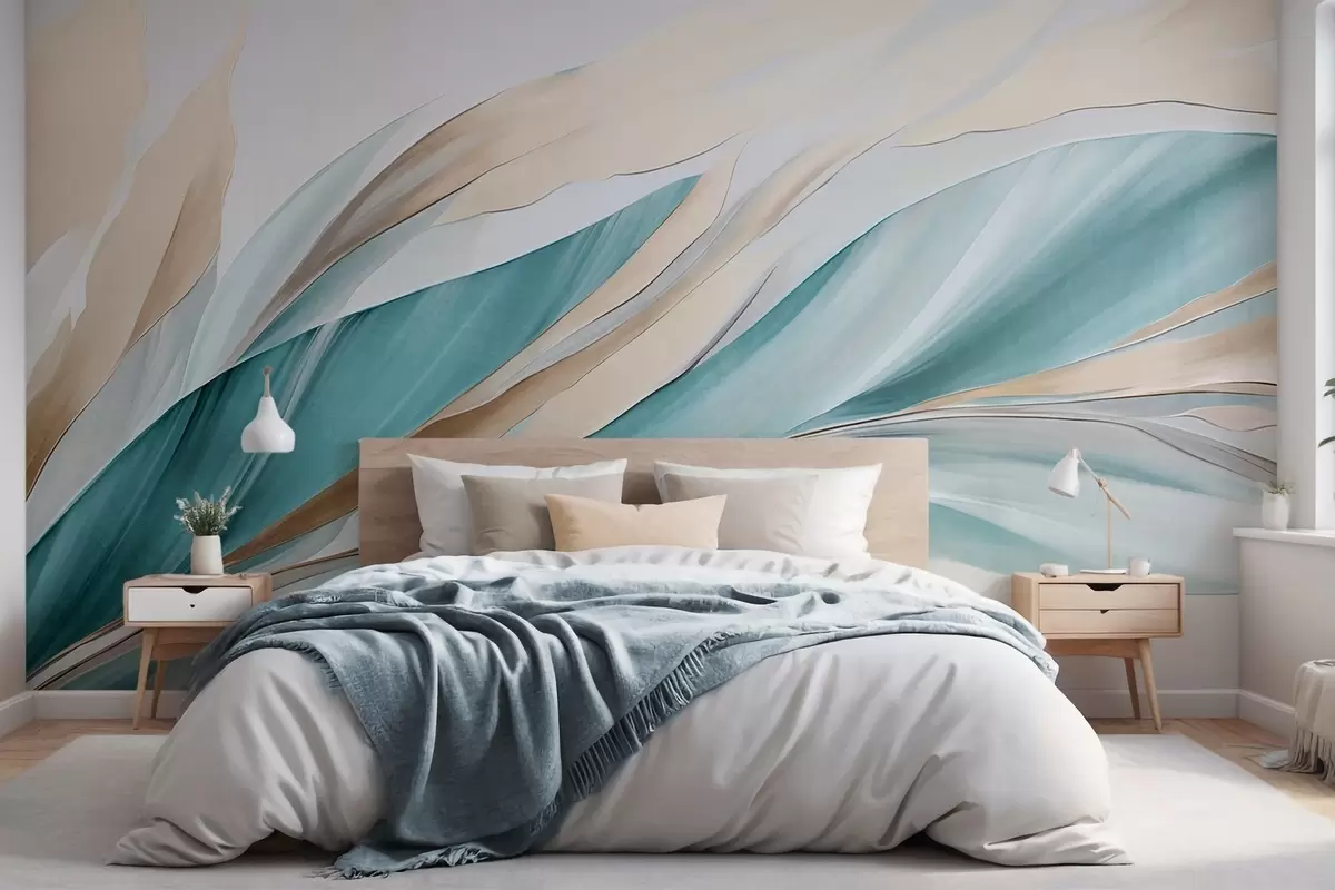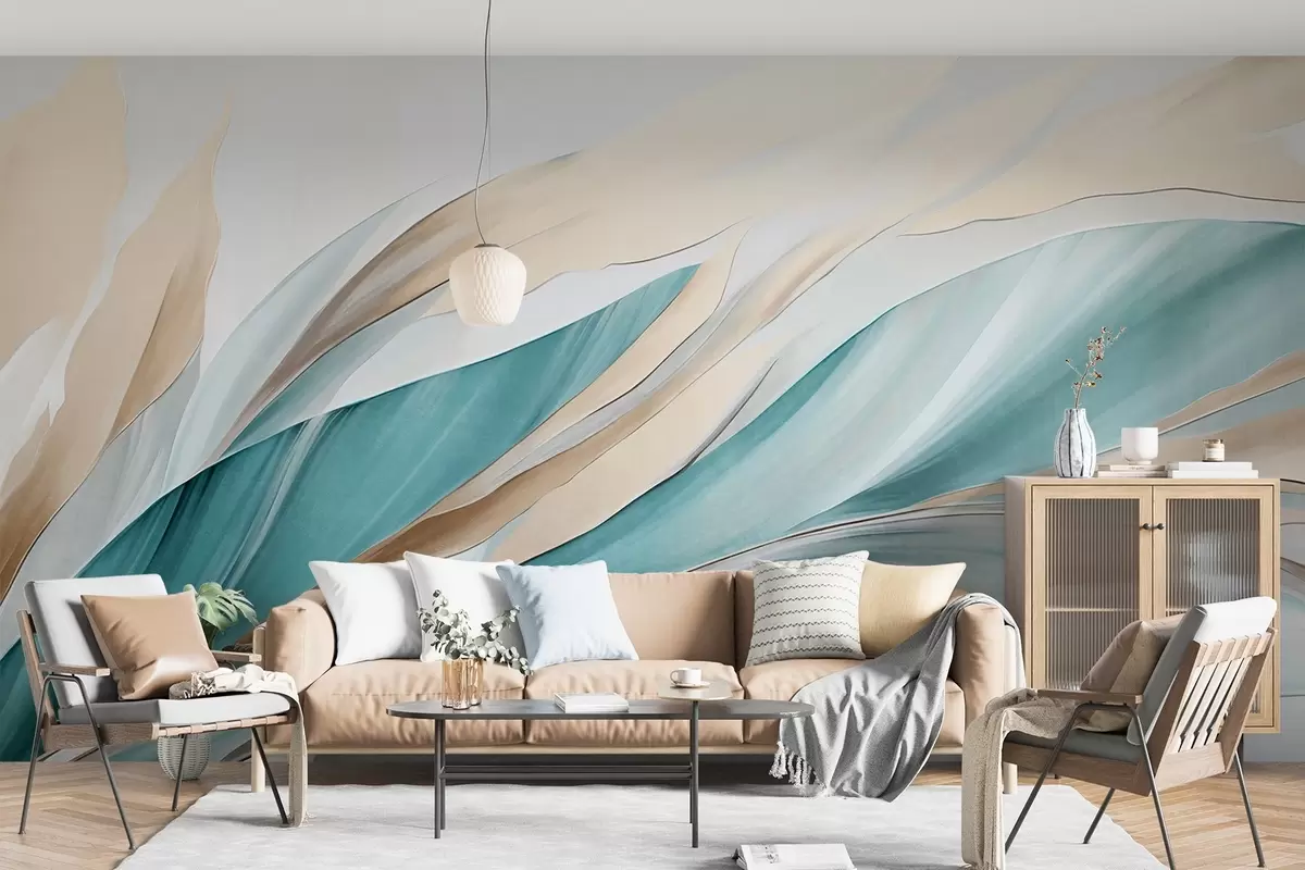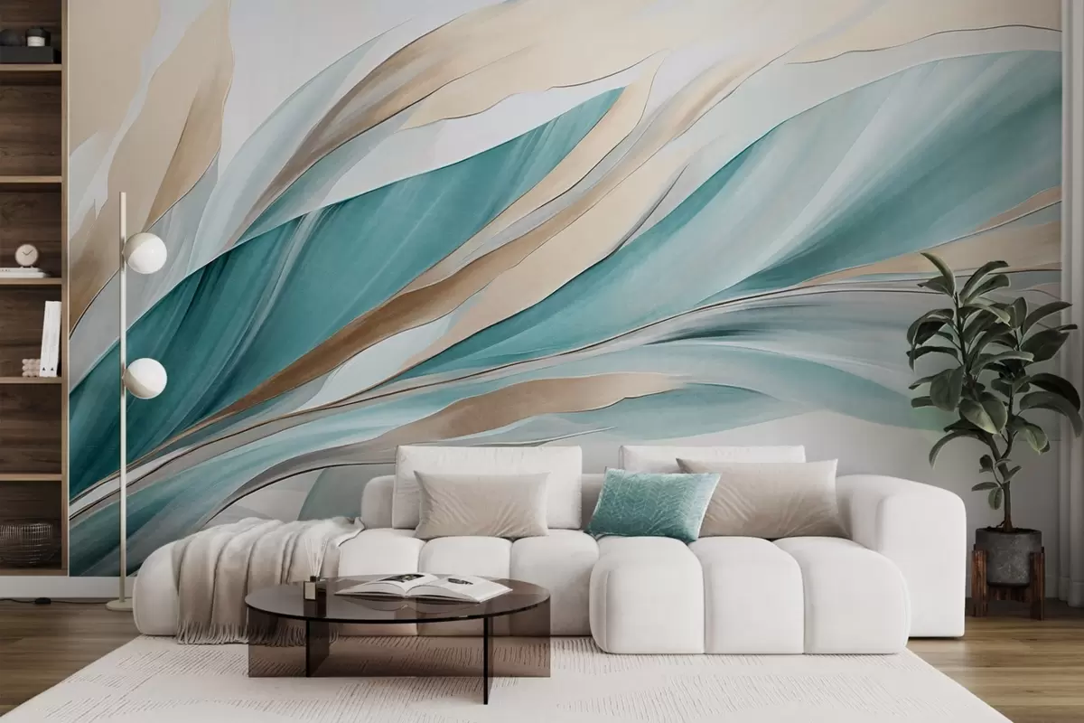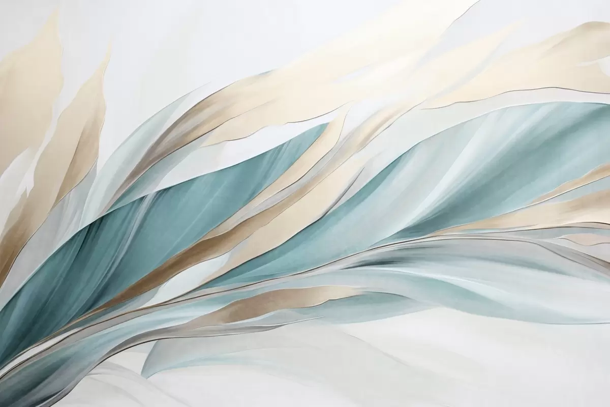 Valokuvatapetti Abstrakti virtaava aaltojen kuvio sinivihreällä ja keltaisella, ohuilla muodoilla ja viivoilla, valkoisella taustalla, teksturoitu taide Nr w09585