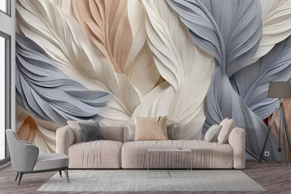 Valokuvatapetti Abstraktit, kerrokselliset höyhenet kermanvärisissä, beigeissä ja vaaleansinisissä sävyissä, teksturoitu, orgaaninen ulkonäkö Nr w09603