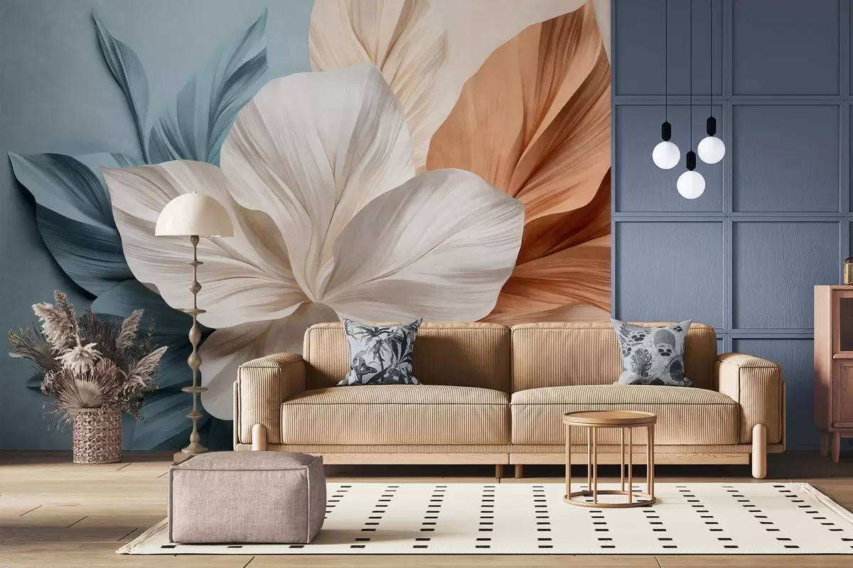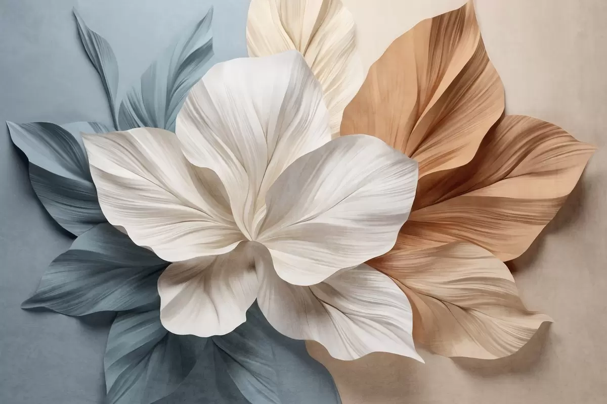 Valokuvatapetti Abstrakti moniterälehtinen kukka, jossa on teksturoidut lehdet persikan ja sinisen sävyissä, pehmeä tausta Nr w09604