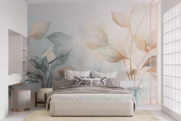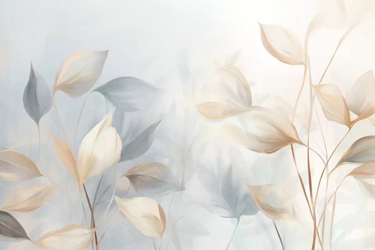 Valokuvatapetti Pehmeät, herkät, läpikuultavat lehdet hillityissä beige-, persikka- ja vaaleansinisissä sävyissä, teksturoitu pastellitaide Nr w09607