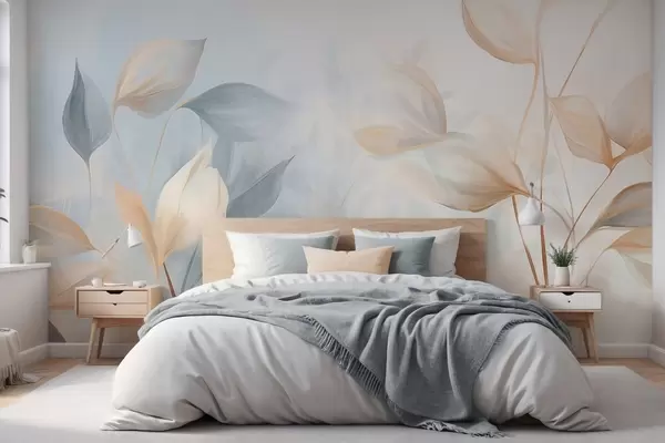 Valokuvatapetti Pehmeät, herkät, läpikuultavat lehdet hillityissä beige-, persikka- ja vaaleansinisissä sävyissä, teksturoitu pastellitaide Nr w09607