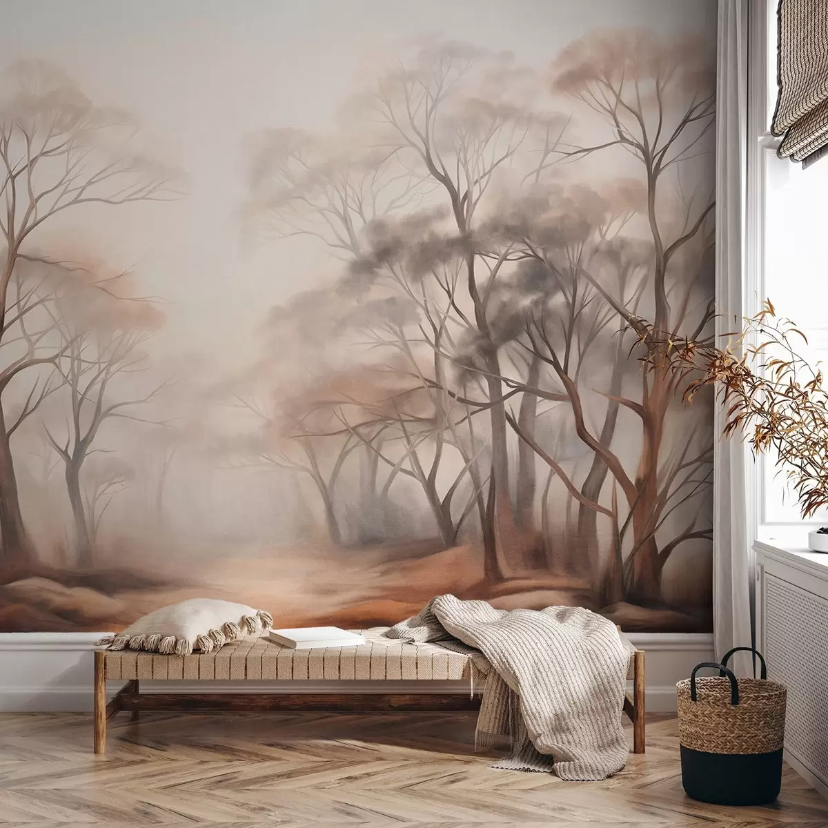 Valokuvatapetti Teksturoidut puut sumuisessa metsämaastossa, sumuinen maisema hillityillä väreillä ja pehmeällä valaistuksella Nr w09609