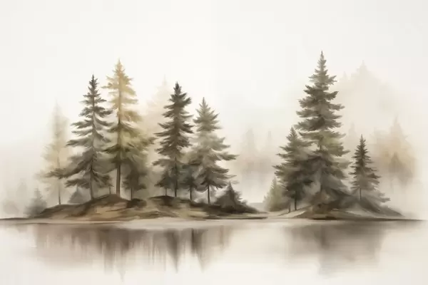 Valokuvatapetti Teksturoitu sumuinen metsä, jossa on korkeita mäntyjä, maalausjäljitelmä Nr w09610