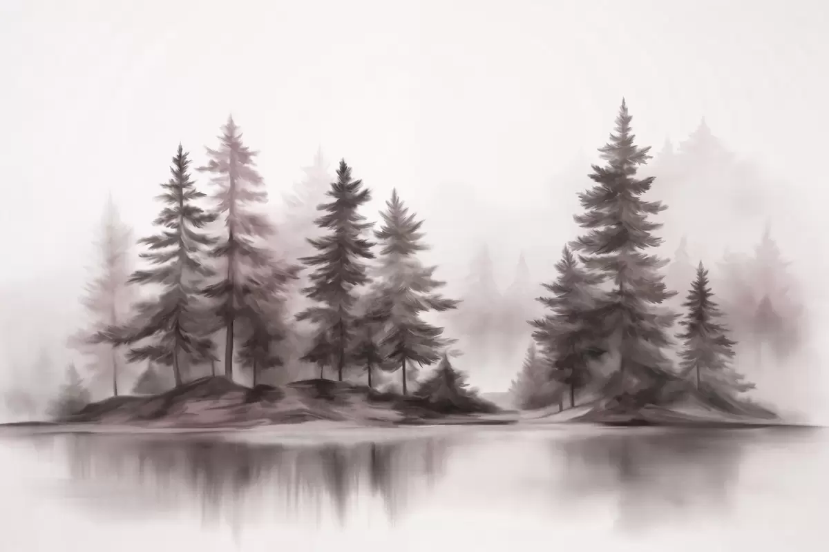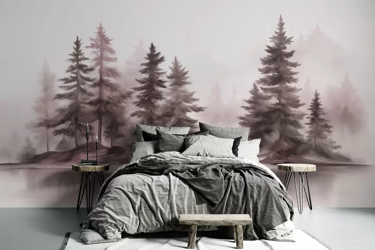 Valokuvatapetti Teksturoitu sumuinen metsä, jossa on korkeita mäntyjä, maalausjäljitelmä Nr w09610v1