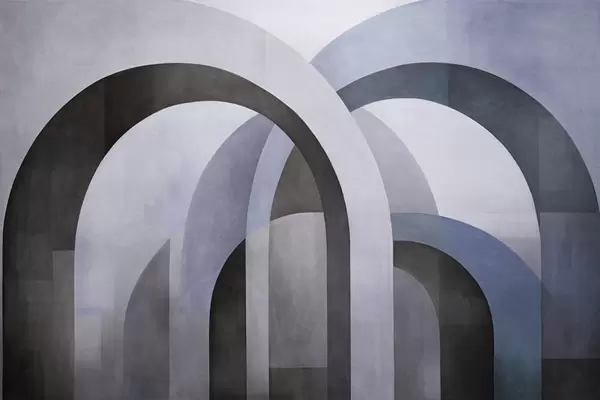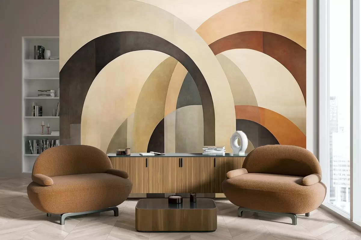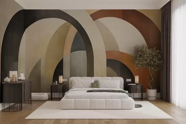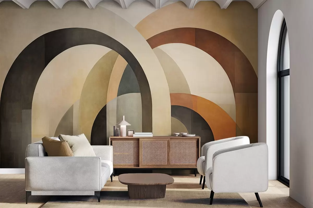 Valokuvatapetti Abstrakti, teksturoitu geometrinen kaari maanläheisissä beige-, ruskea- ja harmaasävyissä, kerroksellinen moderni arkkitehtoninen muotoilu. Nr w09611