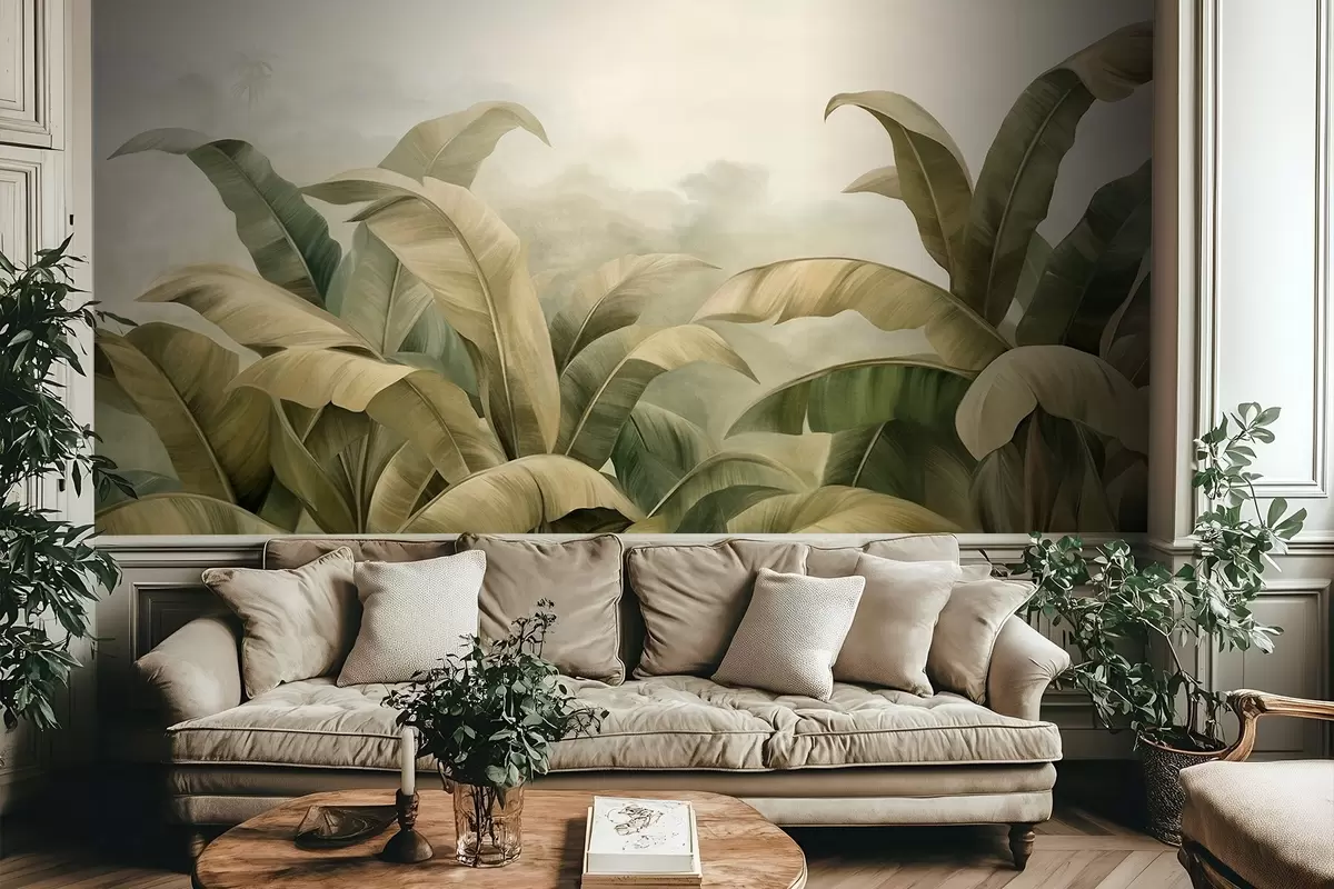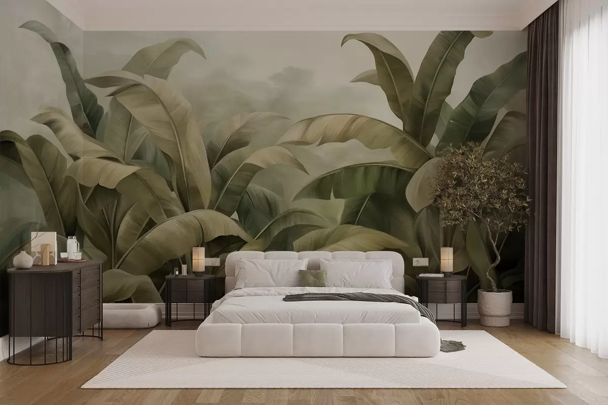 Valokuvatapetti Teksturoitu tiheä viidakkomaisema, jossa on suuria banaanilehtiä hillityissä vihreissä ja beigeissä sävyissä. Nr w09613