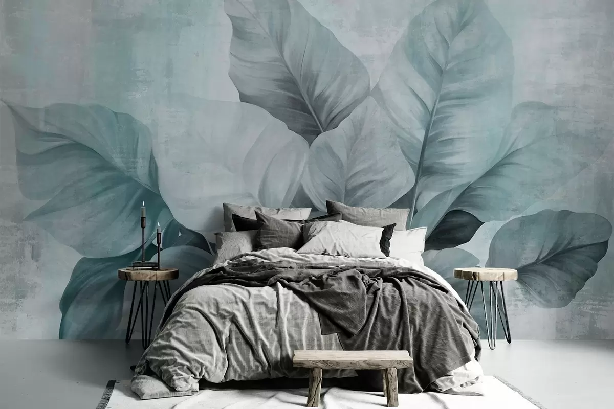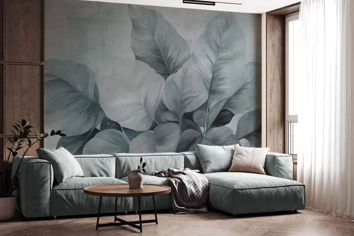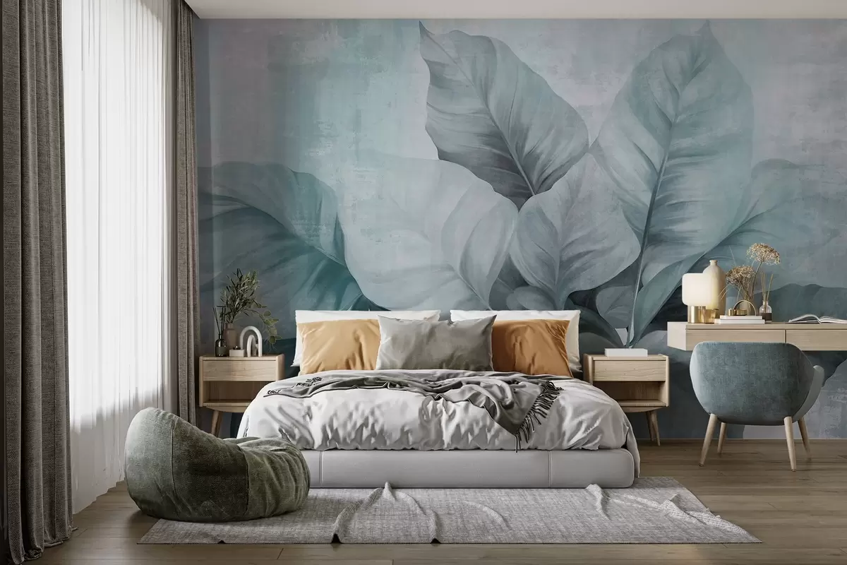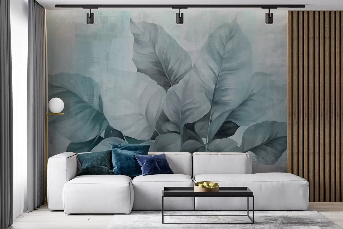 Valokuvatapetti Teksturoitu maalaus, joka jäljittelee suuria, vaaleansinisiä lehtiä neutraalilla taustalla ja hienovaraisilla siveltimenvedoilla. Nr w09614v2