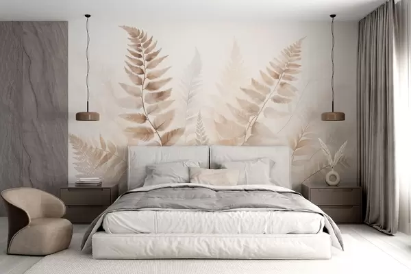 Valokuvatapetti Teksturoidut kuivatut saniaislehtien eri ruskean sävyt, pehmeä, vaalea tausta vesiväri-tyylillä Nr w09615