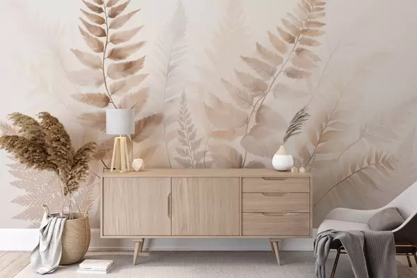 Valokuvatapetti Teksturoidut kuivatut saniaislehtien eri ruskean sävyt, pehmeä, vaalea tausta vesiväri-tyylillä Nr w09615