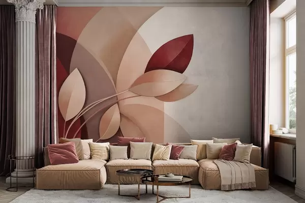 Valokuvatapetti Abstrakti teksturoitu oksa, jossa on ruskean, beigen ja punaisen sävyisiä lehtiä, abstraktien muotojen taustalla. Nr w09618