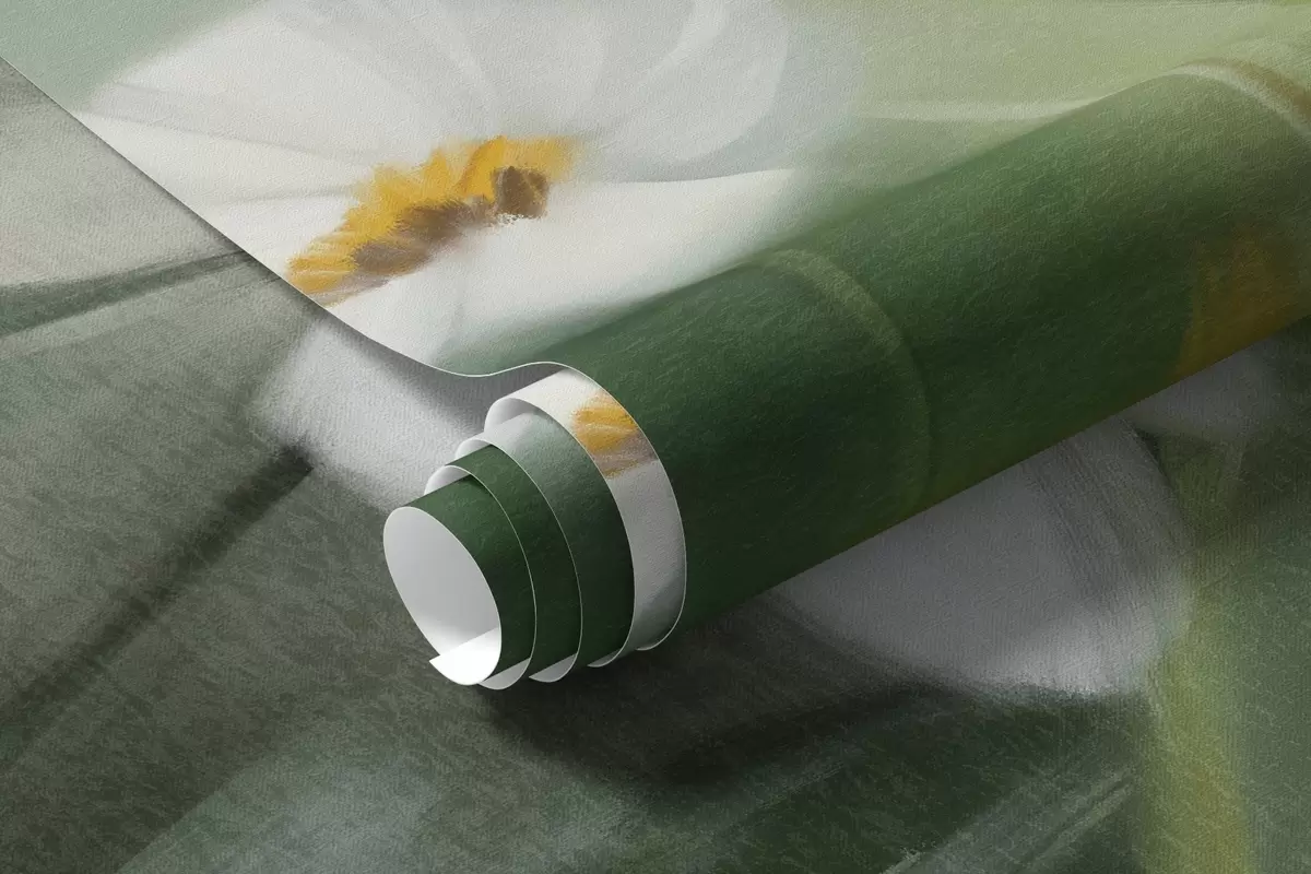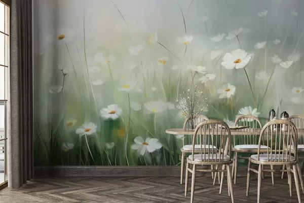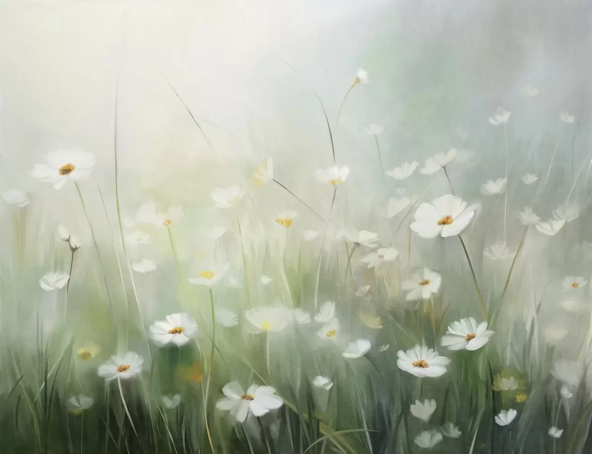 Valokuvatapetti Abstrakti kenttä valkoisia päivänkakkaroita, vihreää ruohoa ja pehmeä, utuinen tausta maalaustekniikalla Nr w09619