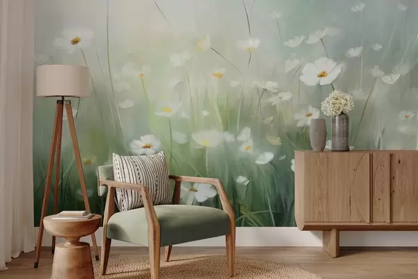 Valokuvatapetti Abstrakti kenttä valkoisia päivänkakkaroita, vihreää ruohoa ja pehmeä, utuinen tausta maalaustekniikalla Nr w09619