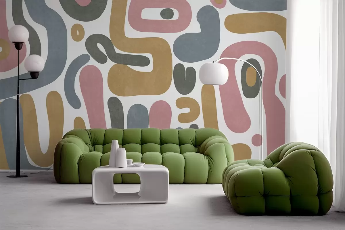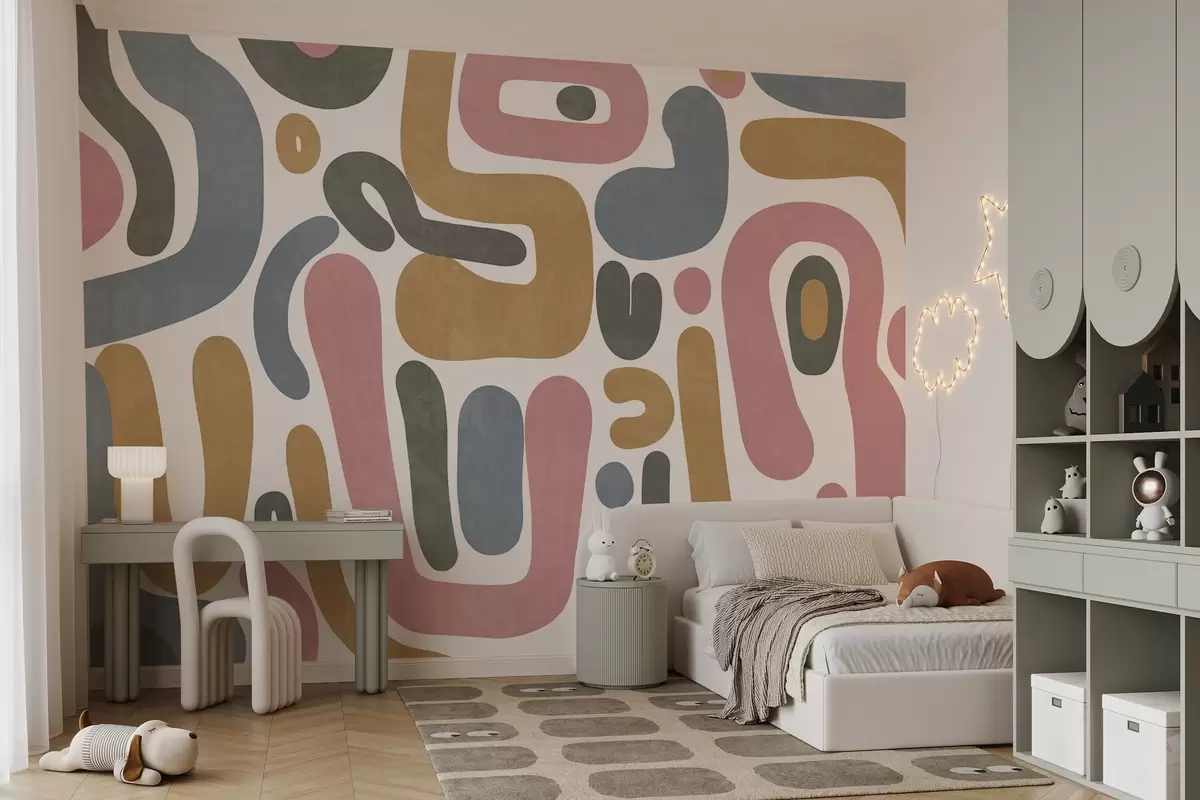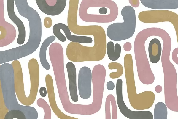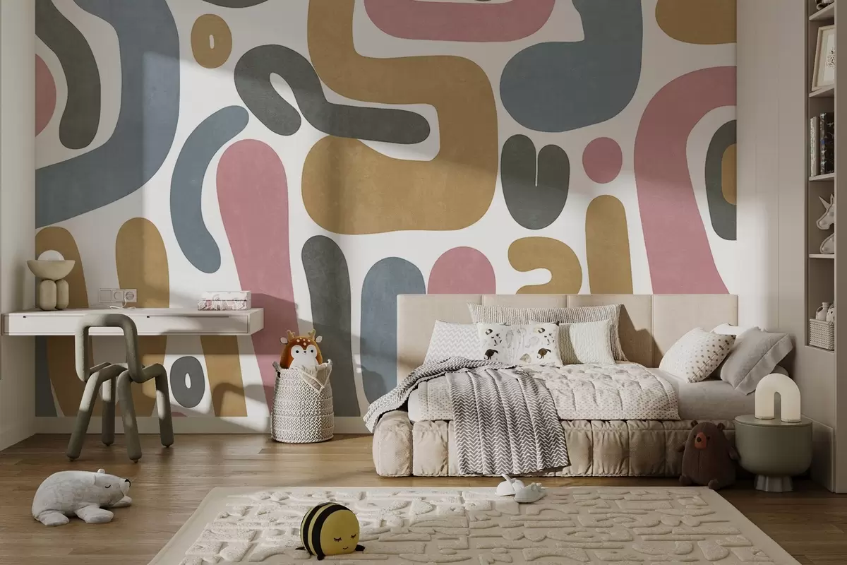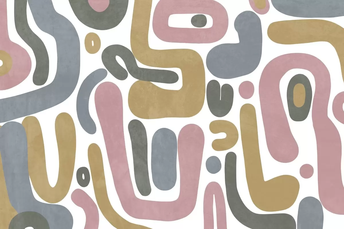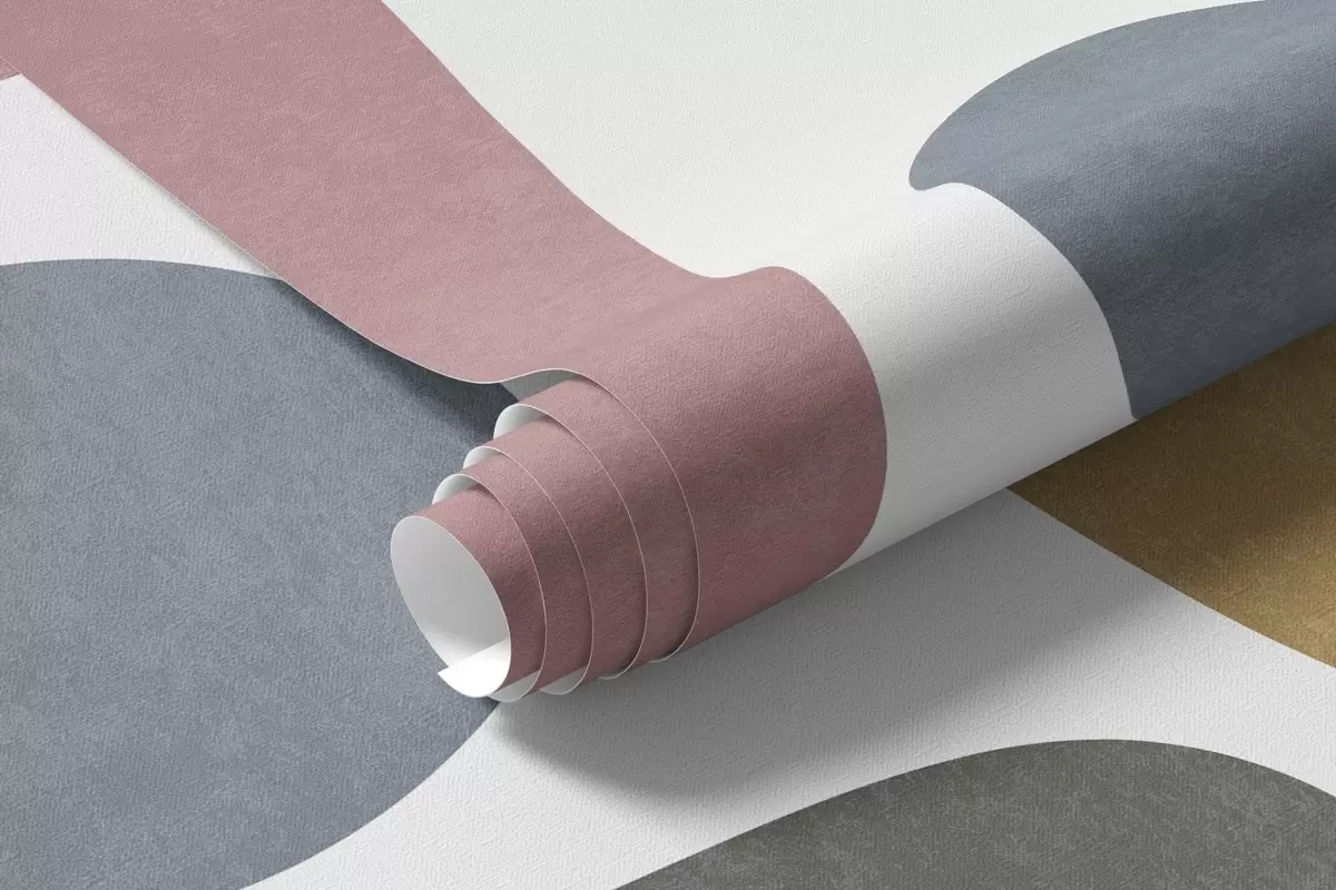Valokuvatapetti Abstraktit teksturoidut muodot pastellinpunaisella, hillityllä sinisellä, sinapinkeltaisella ja harmaalla valkoisella taustalla moderni taide Nr w09620