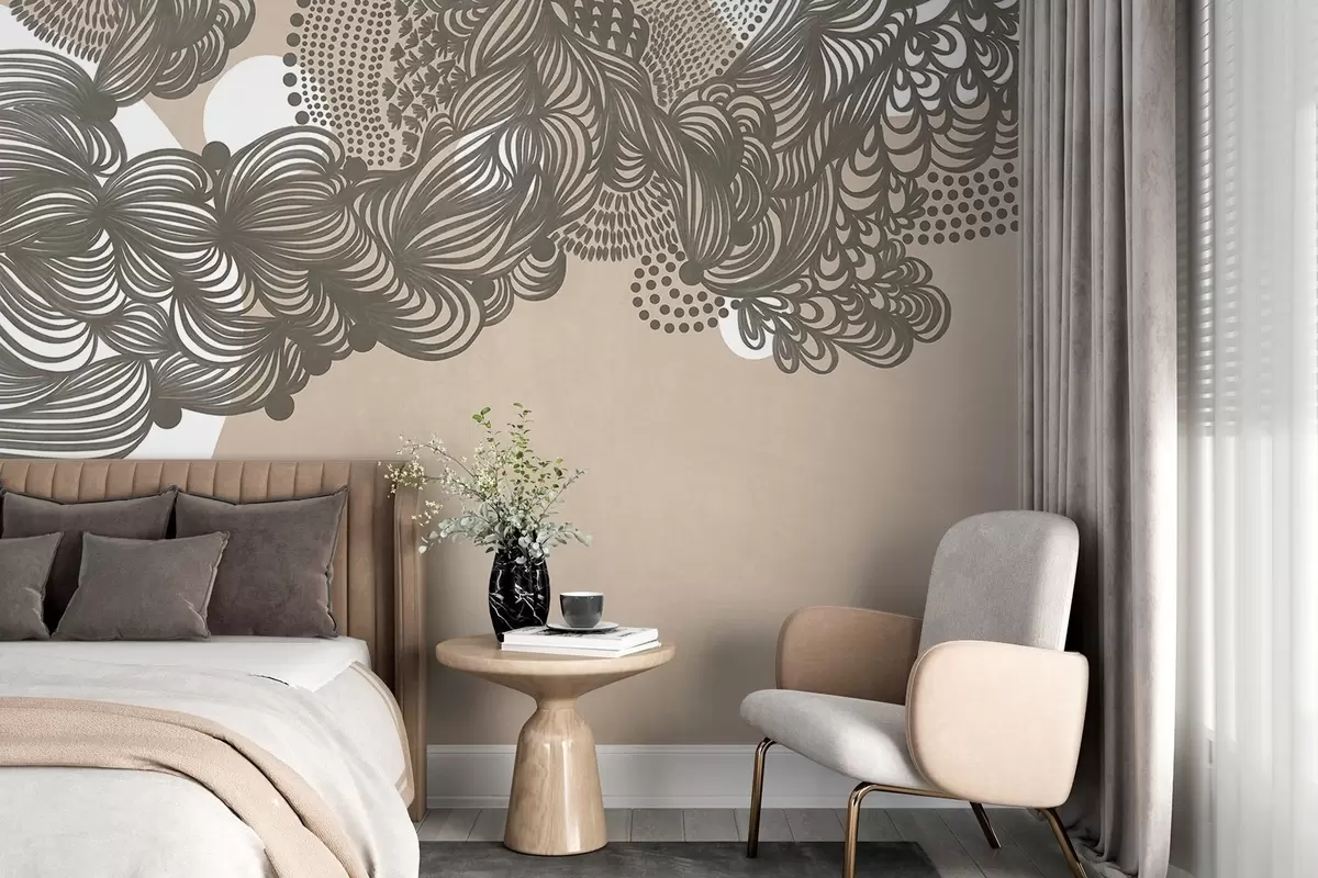 Valokuvatapetti Beigen taustalla oleva abstrakti tekstuurinen kuvio, jossa on monimutkaisia viivoja ja pisteitä. Nr w09621