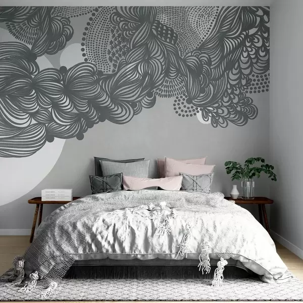 Valokuvatapetti Abstrakti teksturoitu kuvio harmaalla taustalla, jossa on monimutkaisia viivoja ja pisteitä. w09621v1