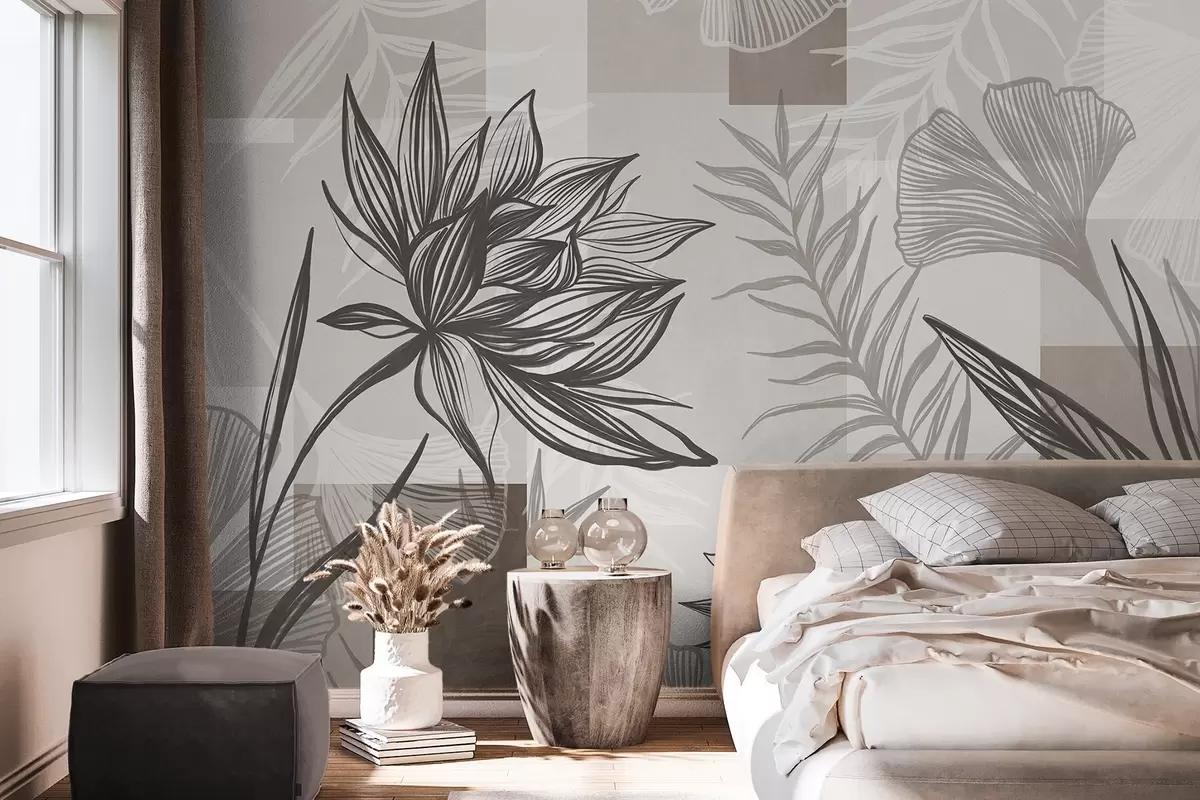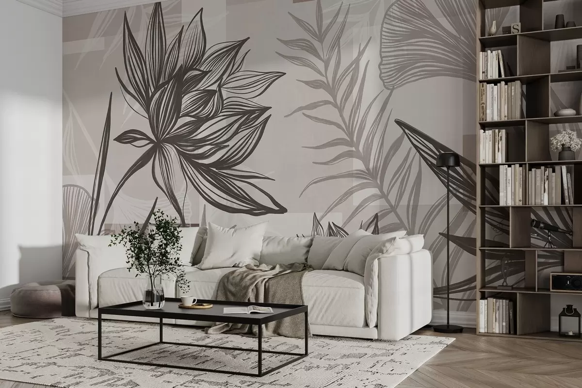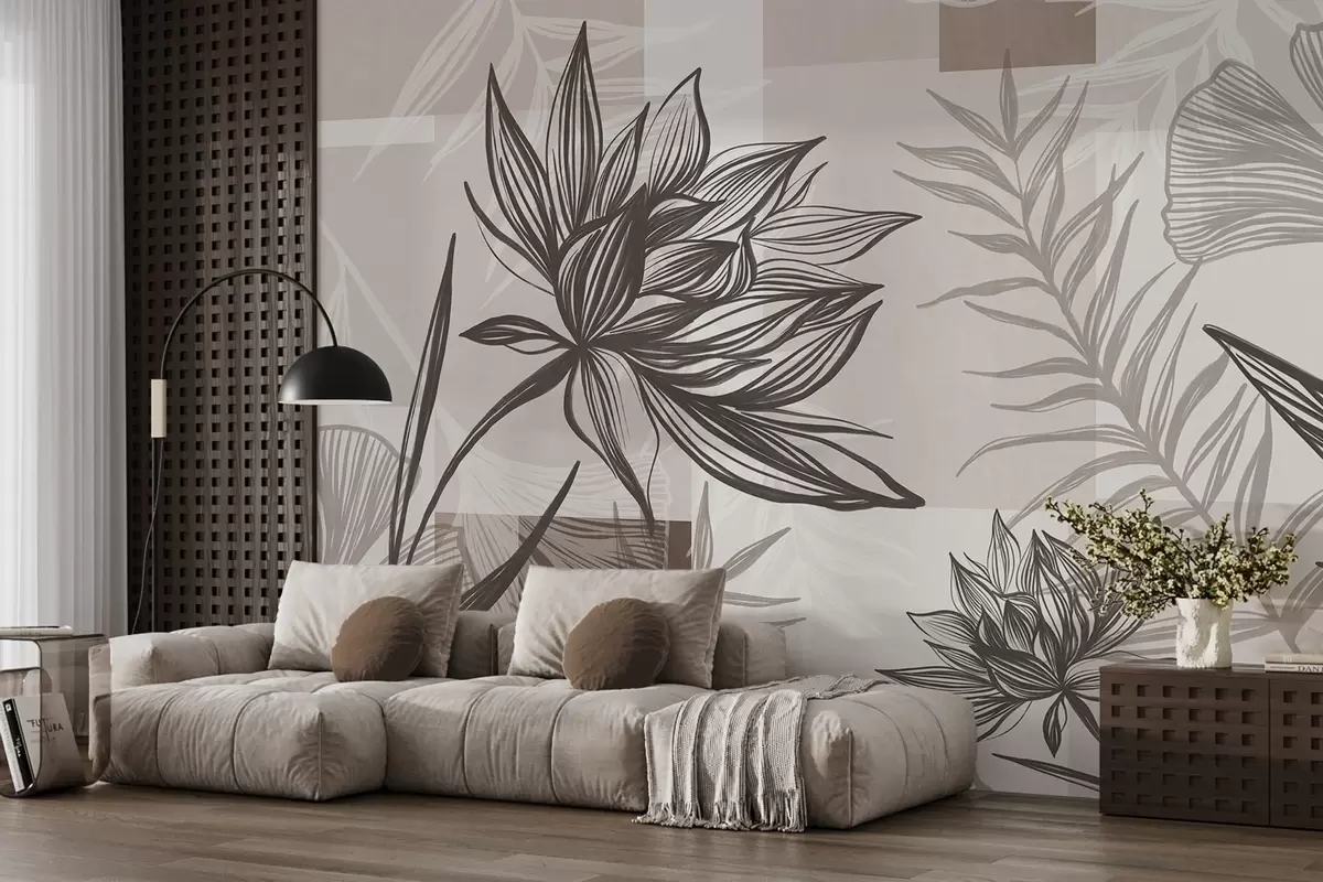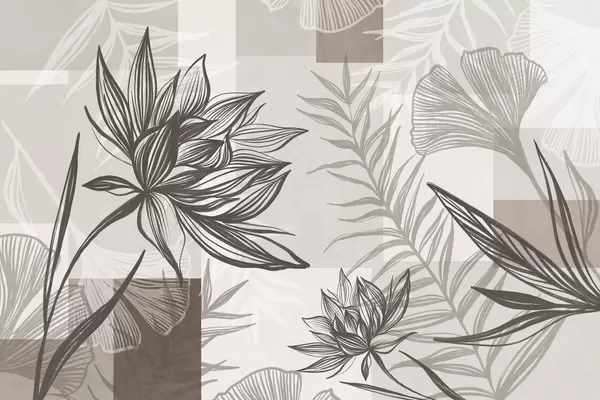 Valokuvatapetti Teksturoidut tyylitellyt kukat ja lehdet ruskean ja beigen sävyissä, geometrisella taustalla, viivapiirros Nr w09629