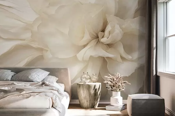 Valokuvatapetti Teksturoitu, herkkä, vaalea kukka, jossa on läpikuultavat terälehdet ja pehmeä abstrakti tausta Nr w09632