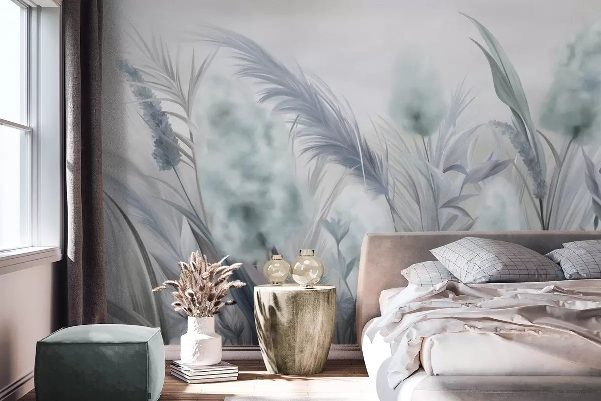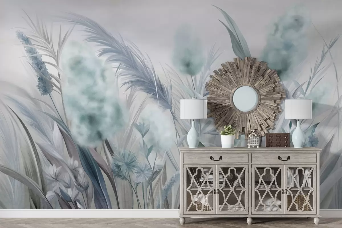 Valokuvatapetti Sininen ja harmaa pampasruoho ja muita kuivattuja kukkia pehmeän, utuisen taivaan taustalla Nr w09635v1