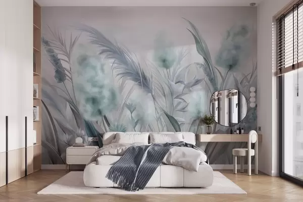 Valokuvatapetti Sininen ja harmaa pampasruoho ja muita kuivattuja kukkia pehmeän, utuisen taivaan taustalla Nr w09635v1