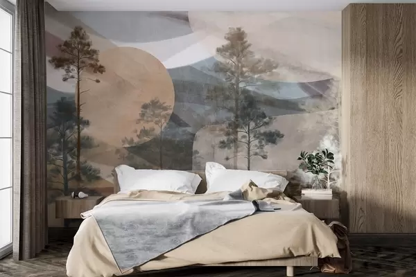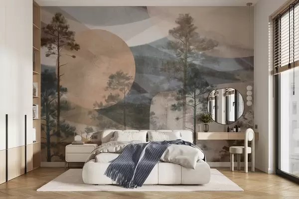 Valokuvatapetti Korkeat mäntypuut hillityn teksturoidussa maisemassa, jossa on abstrakteja pyöreitä muotoja ja kerroksellisia vuoria maanläheisissä sävyissä. Nr w09636