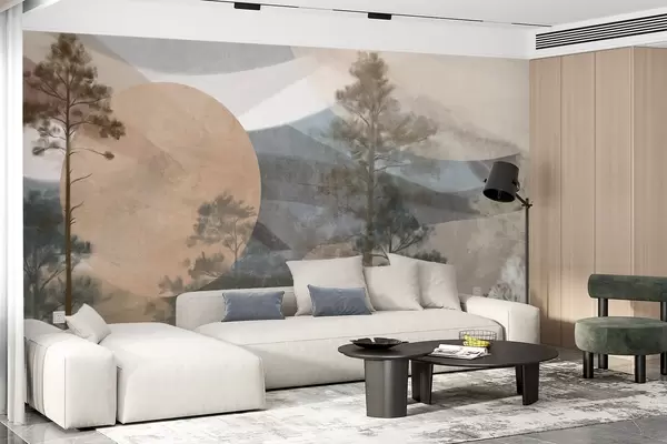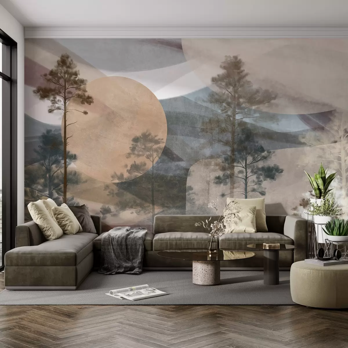 Valokuvatapetti Korkeat mäntypuut hillityn teksturoidussa maisemassa, jossa on abstrakteja pyöreitä muotoja ja kerroksellisia vuoria maanläheisissä sävyissä. Nr w09636