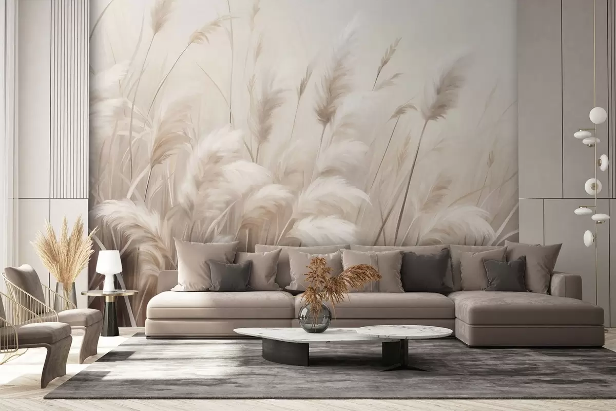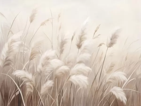 Valokuvatapetti Pitkä, teksturoitu pampasruoho pehmeissä, lämpimissä, neutraaleissa sävyissä, hämärtyneellä, vaalealla taustalla Nr w09637