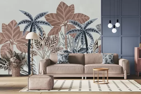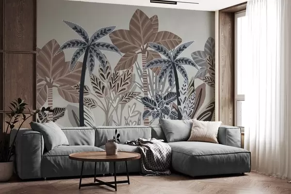 Valokuvatapetti Teksturoidut trooppiset kasvit ja palmut hillityillä väreillä koristeellisessa boho-tyylissä harmaata taustaa vasten Nr w09639v1