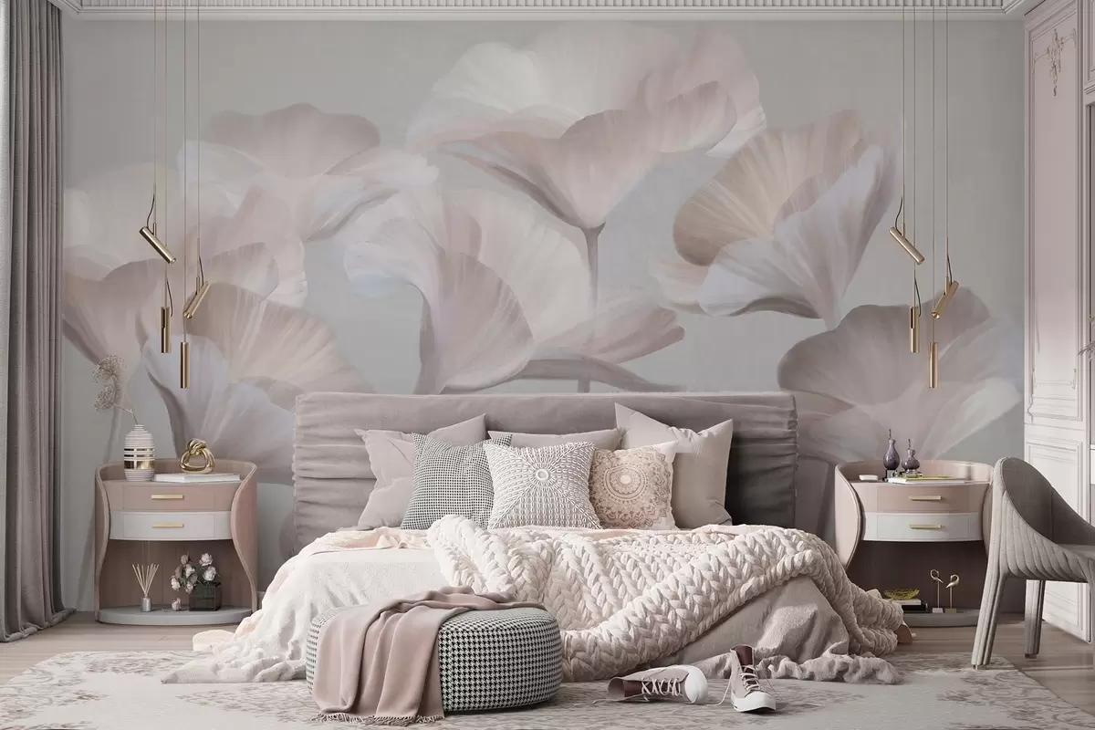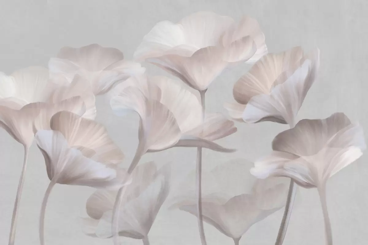 Valokuvatapetti Vaalean persikanväriset, läpikuultavat lootuskukat, joiden herkät terälehdet erottuvat hillityn harmaasta taustasta. Nr w09640