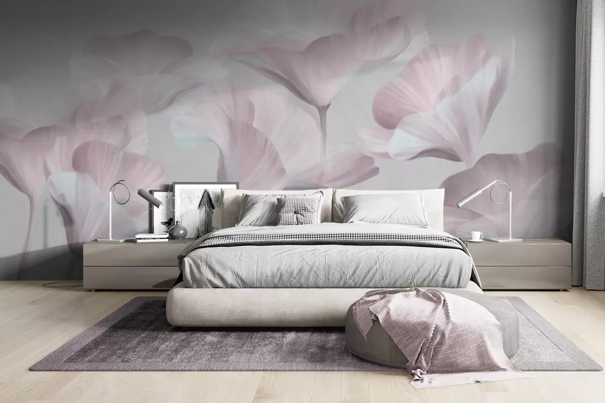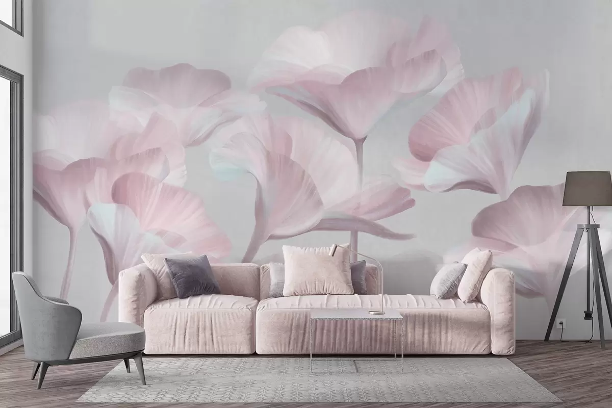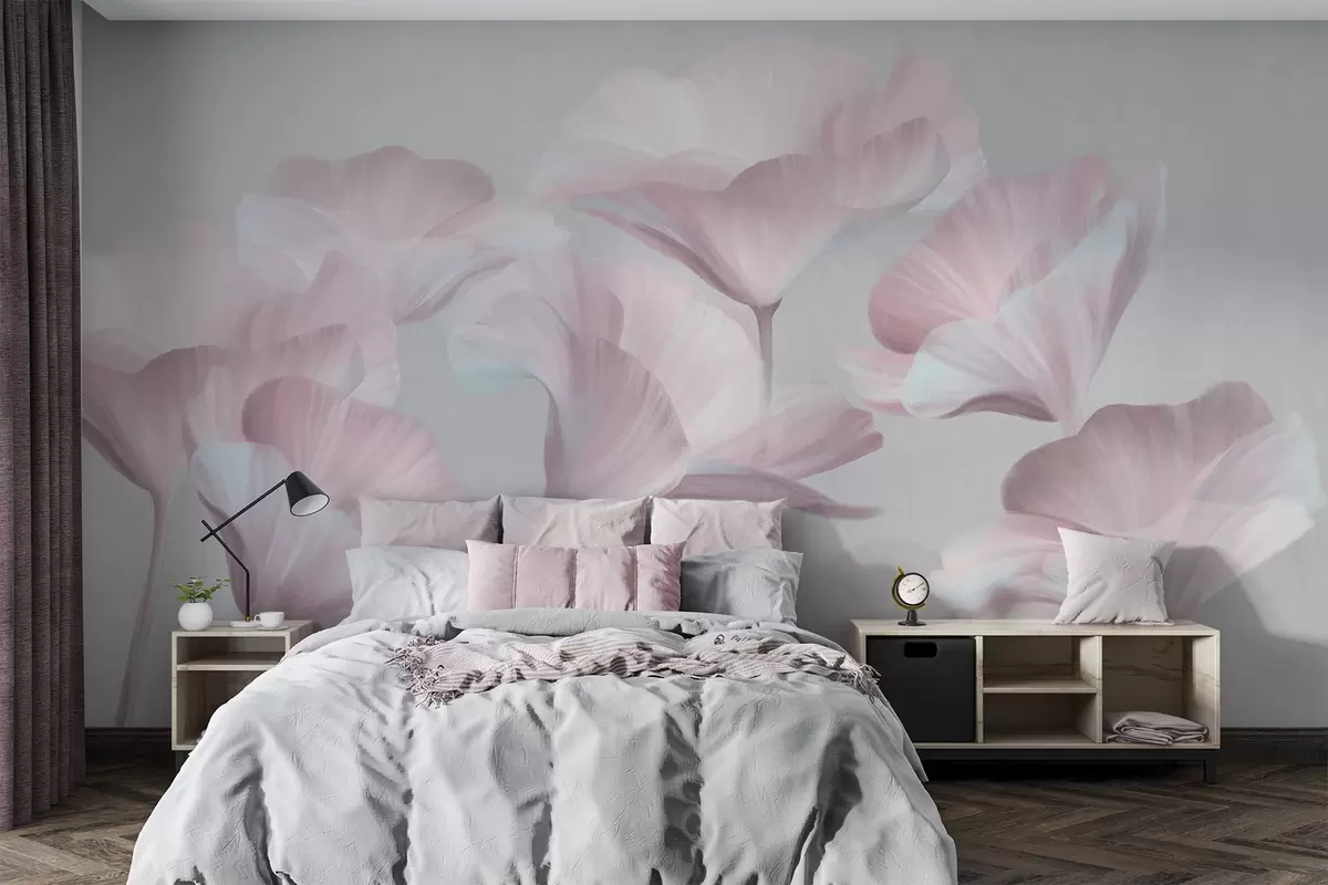 Valokuvatapetti Vaaleanpunaiset, läpikuultavat lootuskukat, joiden herkät terälehdet erottuvat hillityn harmaasta taustasta. Nr w09640v1