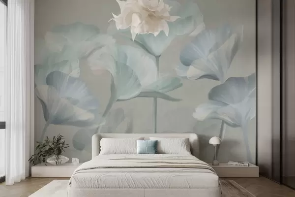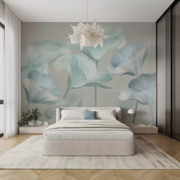 Valokuvatapetti Vaalean turkoosit, läpikuultavat lootuskukat, joiden herkät terälehdet erottuvat hillityn harmaasta taustasta. Nr w09640v2