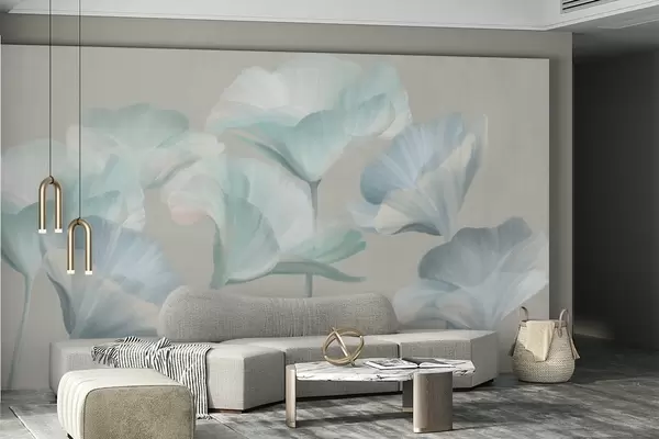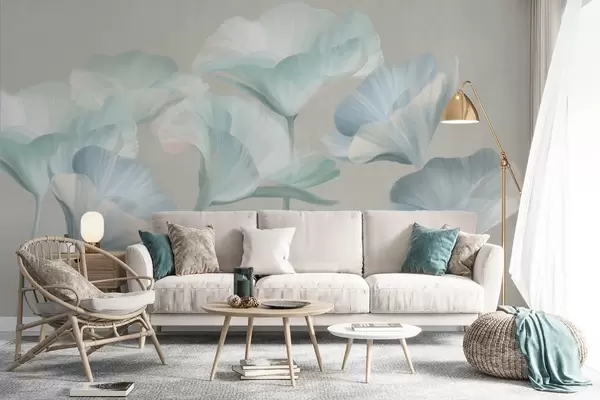 Valokuvatapetti Vaalean turkoosit, läpikuultavat lootuskukat, joiden herkät terälehdet erottuvat hillityn harmaasta taustasta. Nr w09640v2