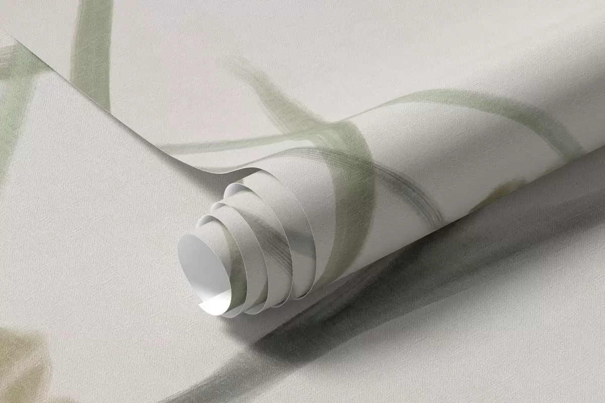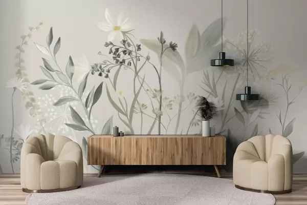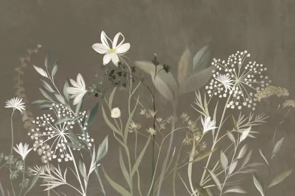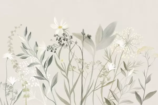 Valokuvatapetti Hienostuneen tekstuuriset luonnonkukat ja lehdet hillityissä vihreän ja kerman sävyissä pehmeän beigeä taustaa vasten. Nr w09641