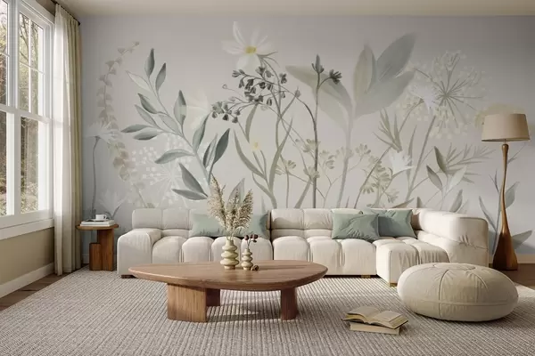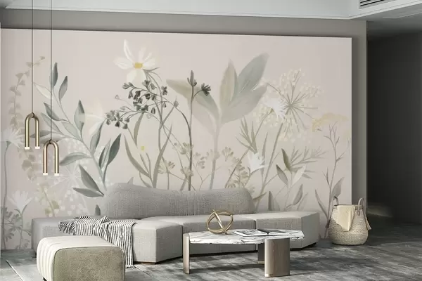 Valokuvatapetti Hienostuneen tekstuuriset luonnonkukat ja lehdet hillityissä vihreän ja kerman sävyissä pehmeän beigeä taustaa vasten. Nr w09641