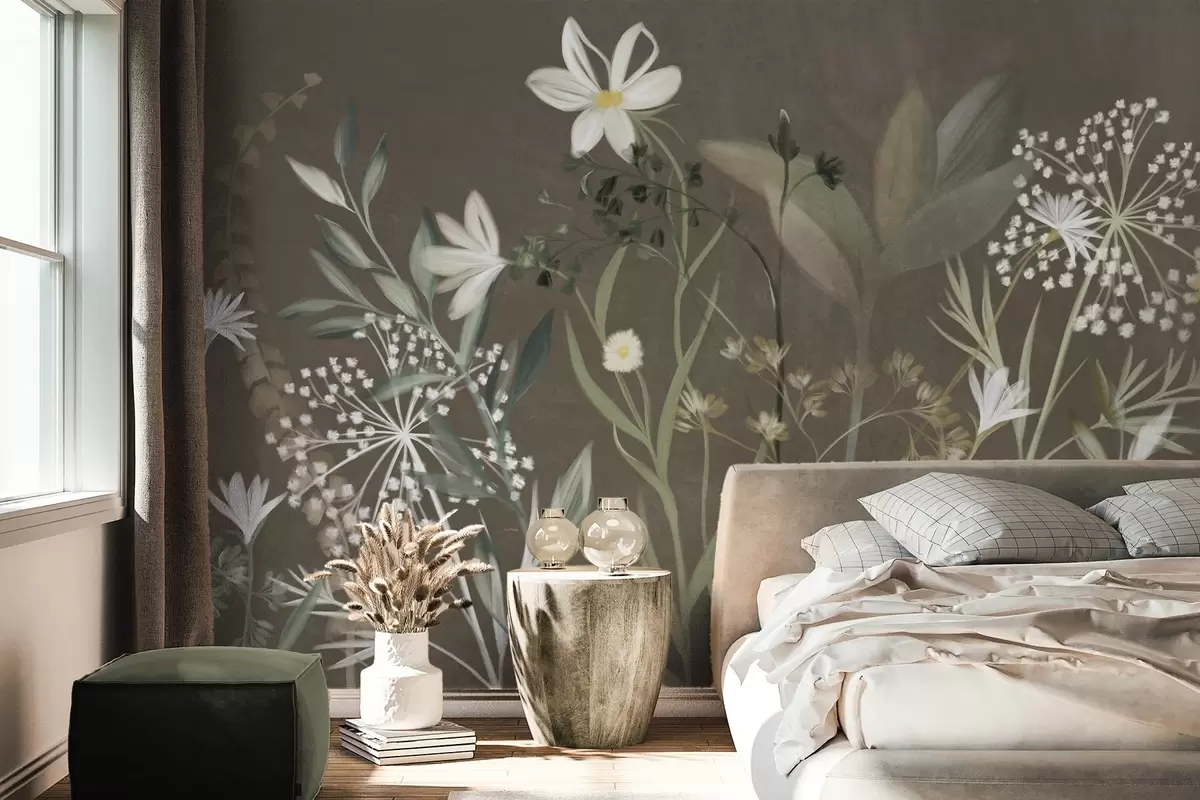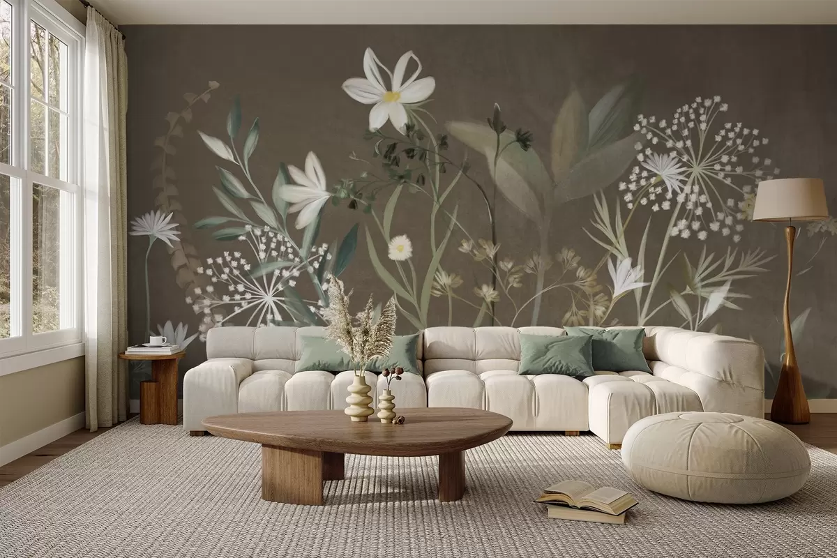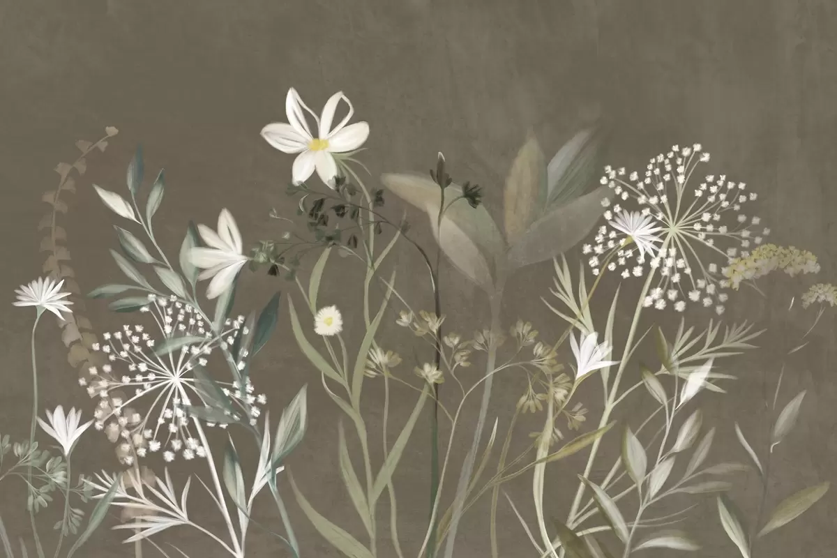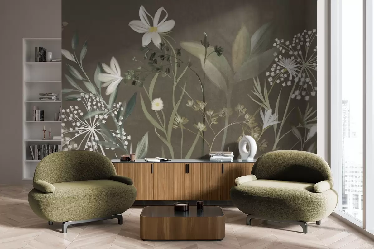 Valokuvatapetti Hienostuneesti kuvioidut luonnonkukat ja lehdet hillityissä vihreän ja kerman sävyissä ruskeaa taustaa vasten. Nr w09641v1