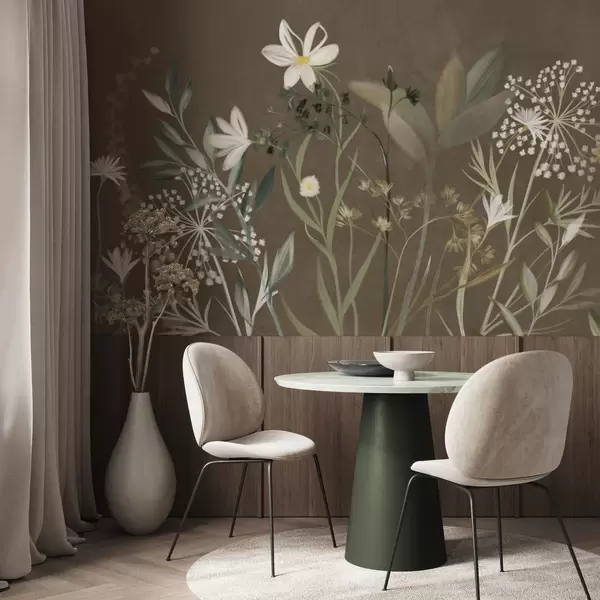 Valokuvatapetti Hienostuneesti kuvioidut luonnonkukat ja lehdet hillityissä vihreän ja kerman sävyissä ruskeaa taustaa vasten. Nr w09641v1