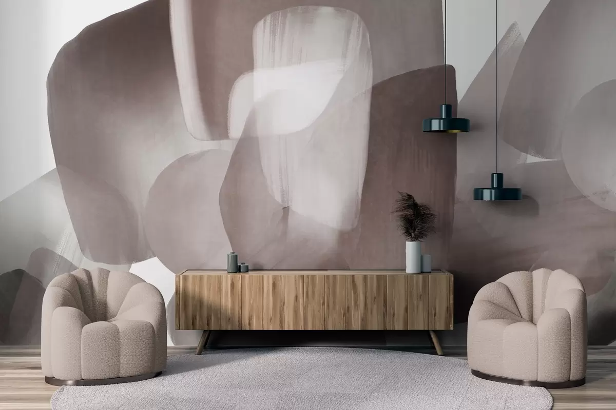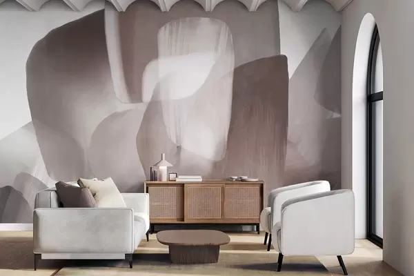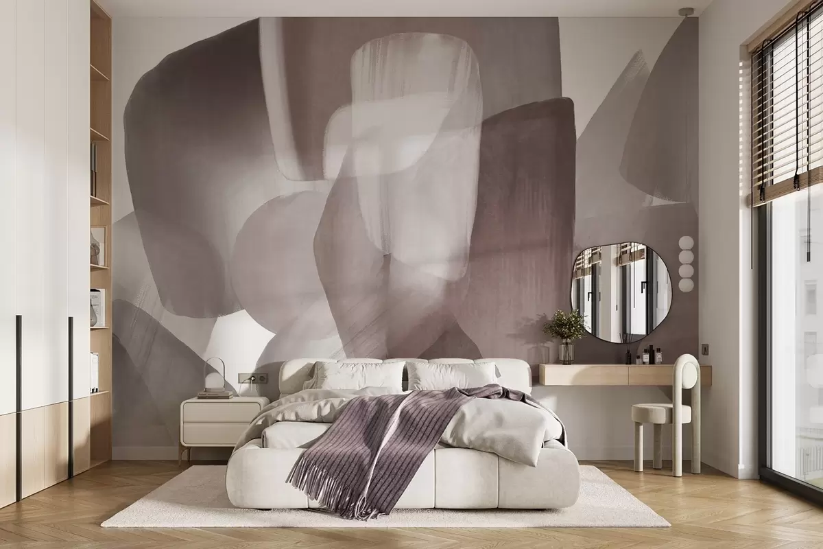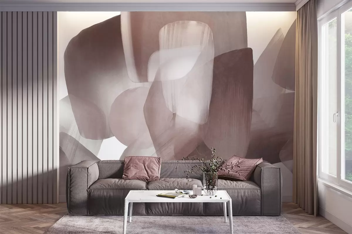 Valokuvatapetti Abstraktit, teksturoidut muodot hillityissä burgundinpunaisissa ja harmaissa sävyissä, pehmeillä reunoilla ja päällekkäisillä kerroksilla. Nr w09642v2