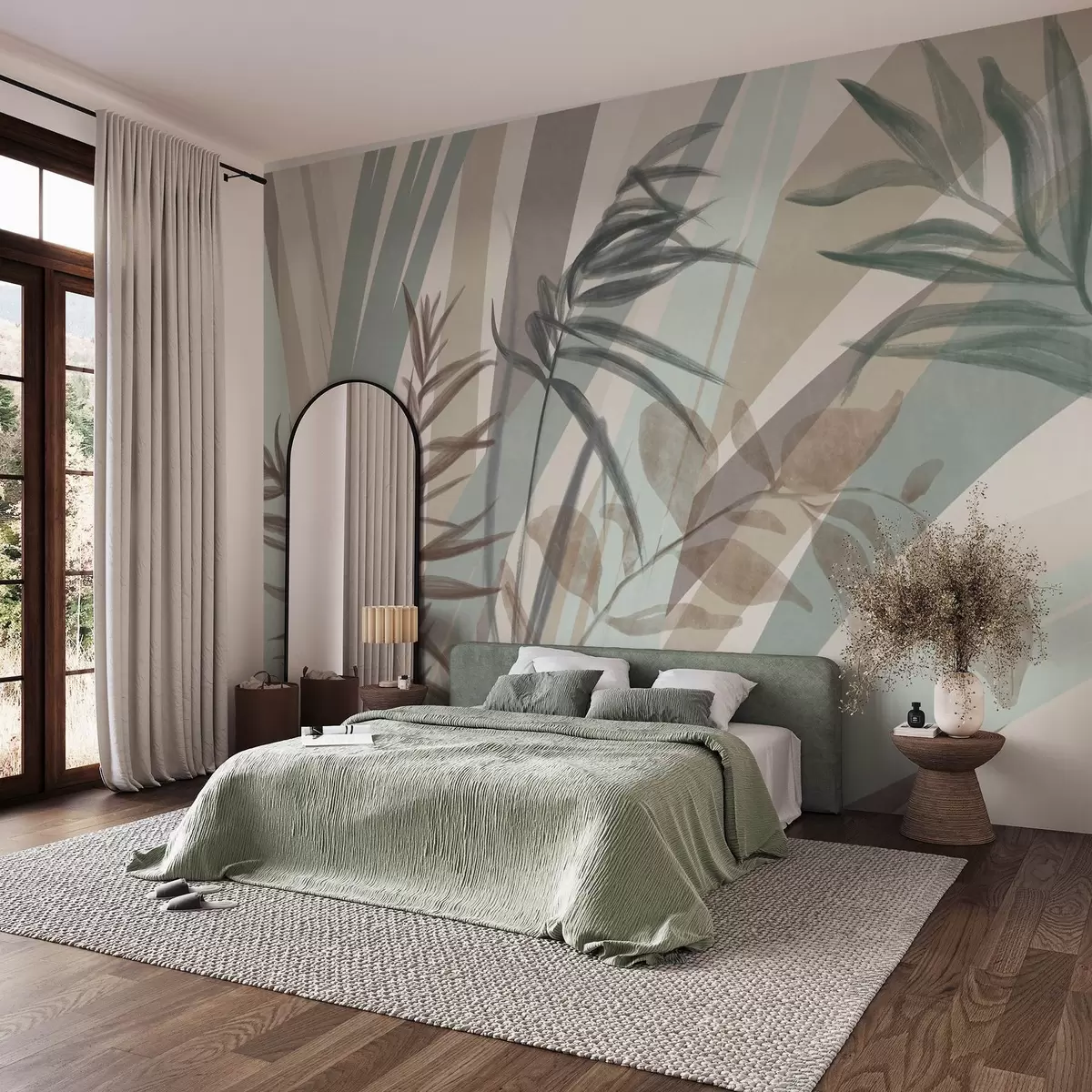 Valokuvatapetti Pitkä, teksturoitu ruoho ja lehdet hillityissä maan sävyissä, taustalla abstrakteja viivoja, jotka luovat orgaanisen painatuksen. Nr w09643