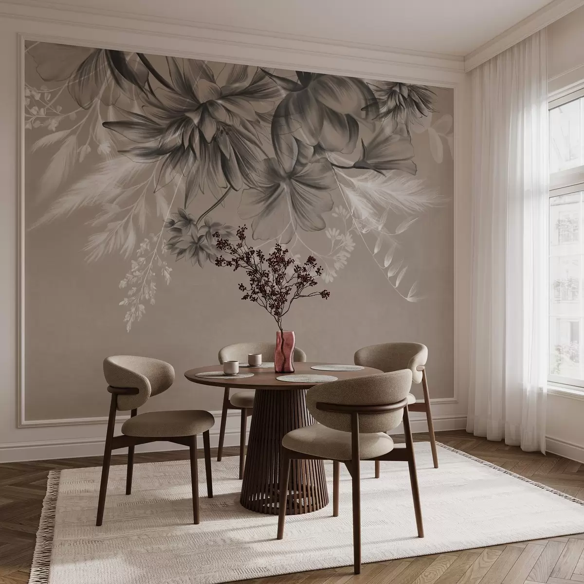 Valokuvatapetti Teksturoidut kukat ja saniaiset tummanharmaissa ja valkoisissa sävyissä hillityn beigeä taustaa vasten piirustustyyli Nr w09644
