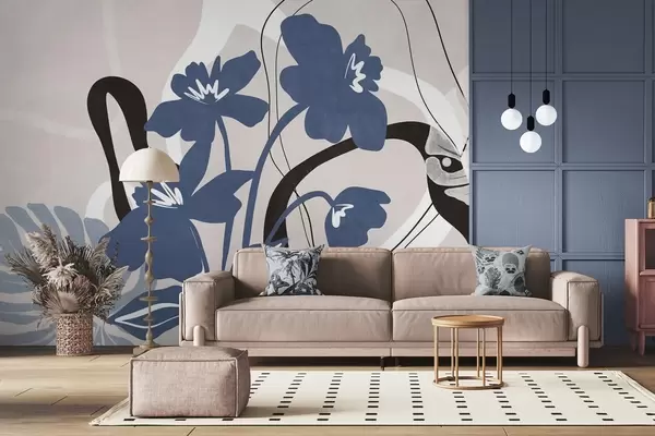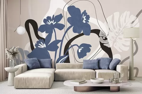Valokuvatapetti Abstrakti teksturoitu sininen kukka, jossa on valkoisia ja mustia muotoja vaaleanbeigen taustalla, minimalistinen taide Nr w09645
