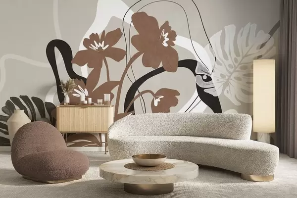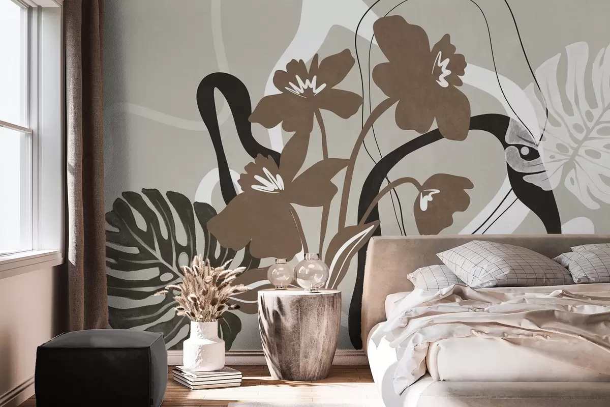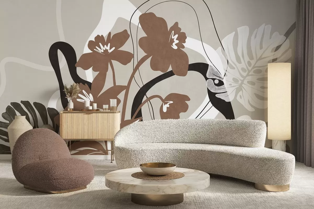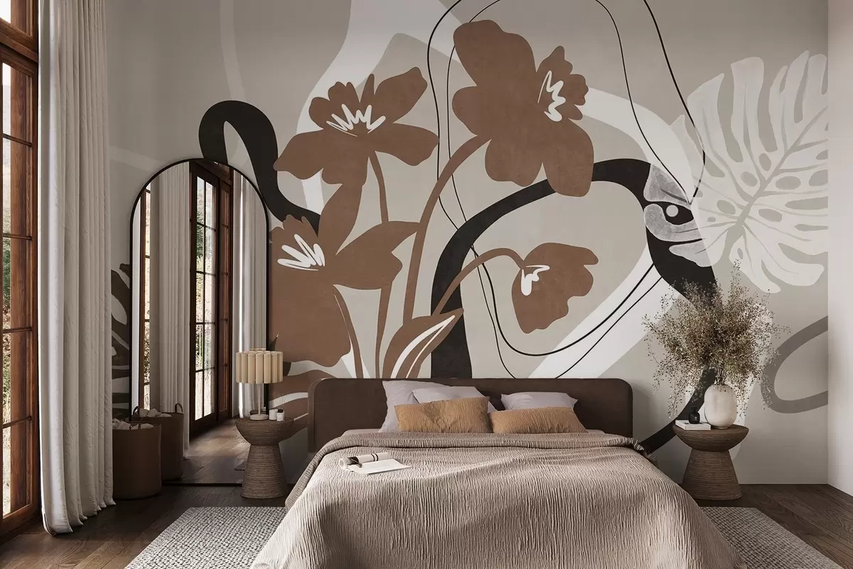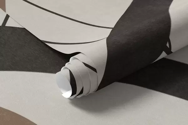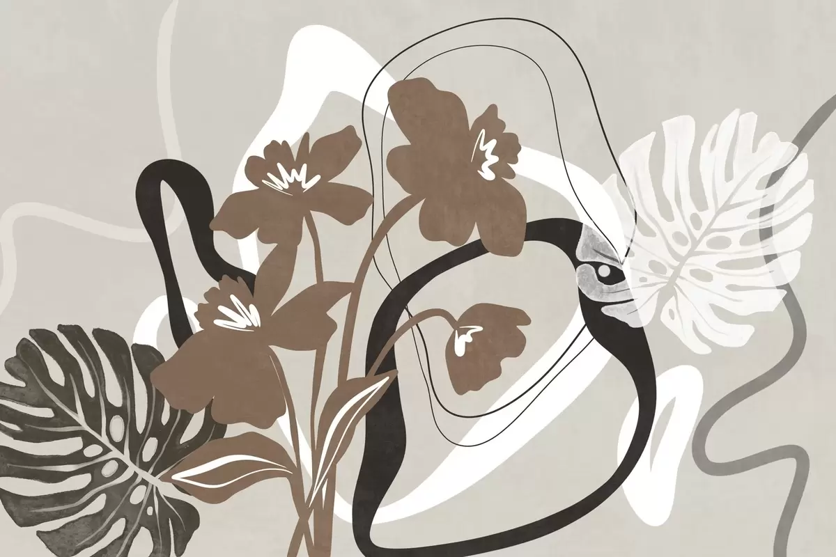 Valokuvatapetti Abstrakti teksturoitu ruskea kukka, jossa on valkoisia ja mustia muotoja beigeä taustaa vasten, minimalistinen taide Nr w09645v1
