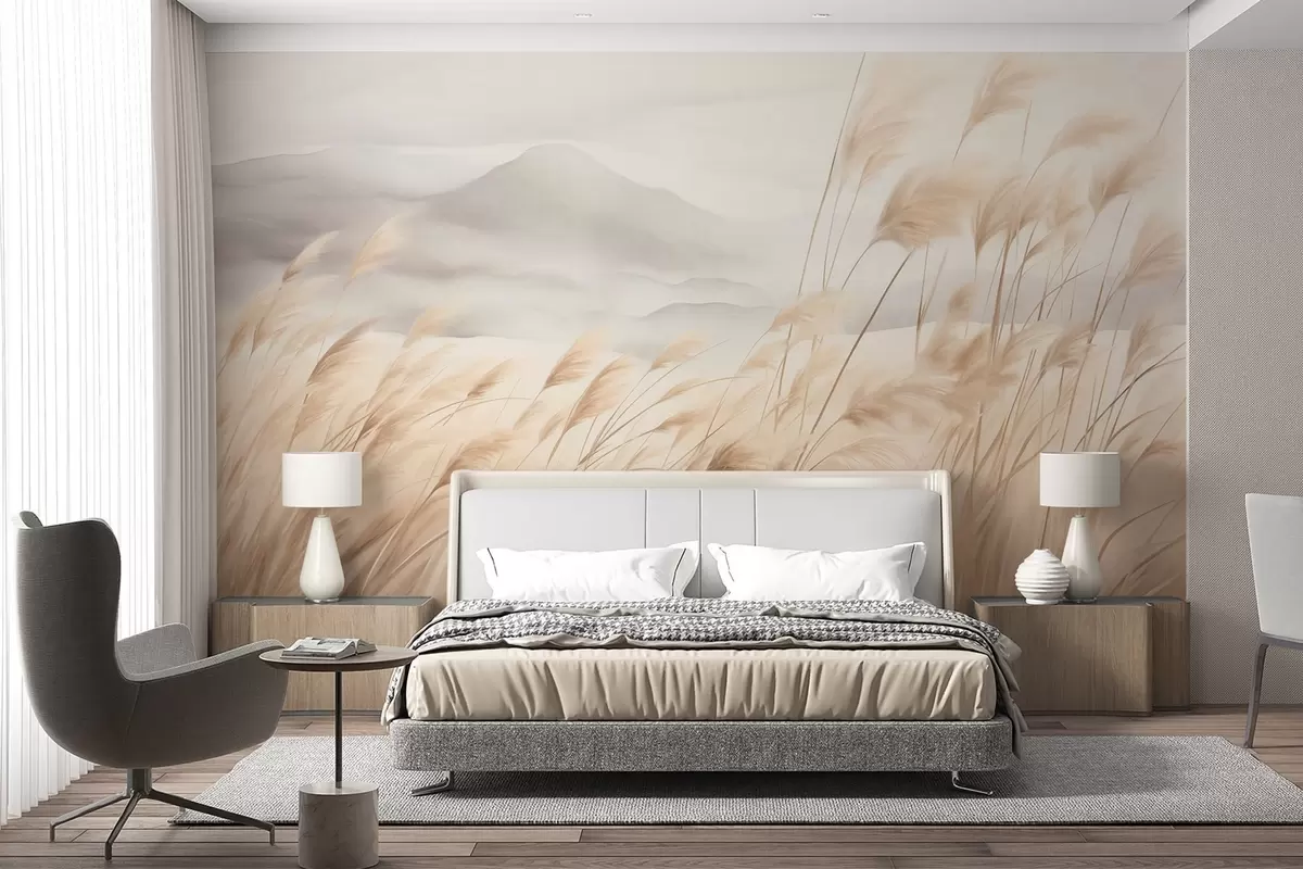 Valokuvatapetti Teksturoitu vuoristomaisema, jossa on korkeaa, kuivaa ruohoa sumuisen taivaan alla Nr w09649